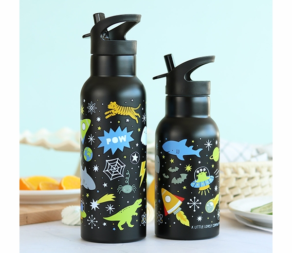 Denna dubbelväggiga vattenflaska i rostfritt stål med galaxtema är perfekt för både skolan och aktiviteter på språng. Flaskan är utmärkt för att hålla både varma och kalla drycker vid rätt temperatur. Den levereras med ett praktiskt sportlock med sugrör som är lätt att öppna och stänger tätt när dryckeshålet trycks tillbaka.