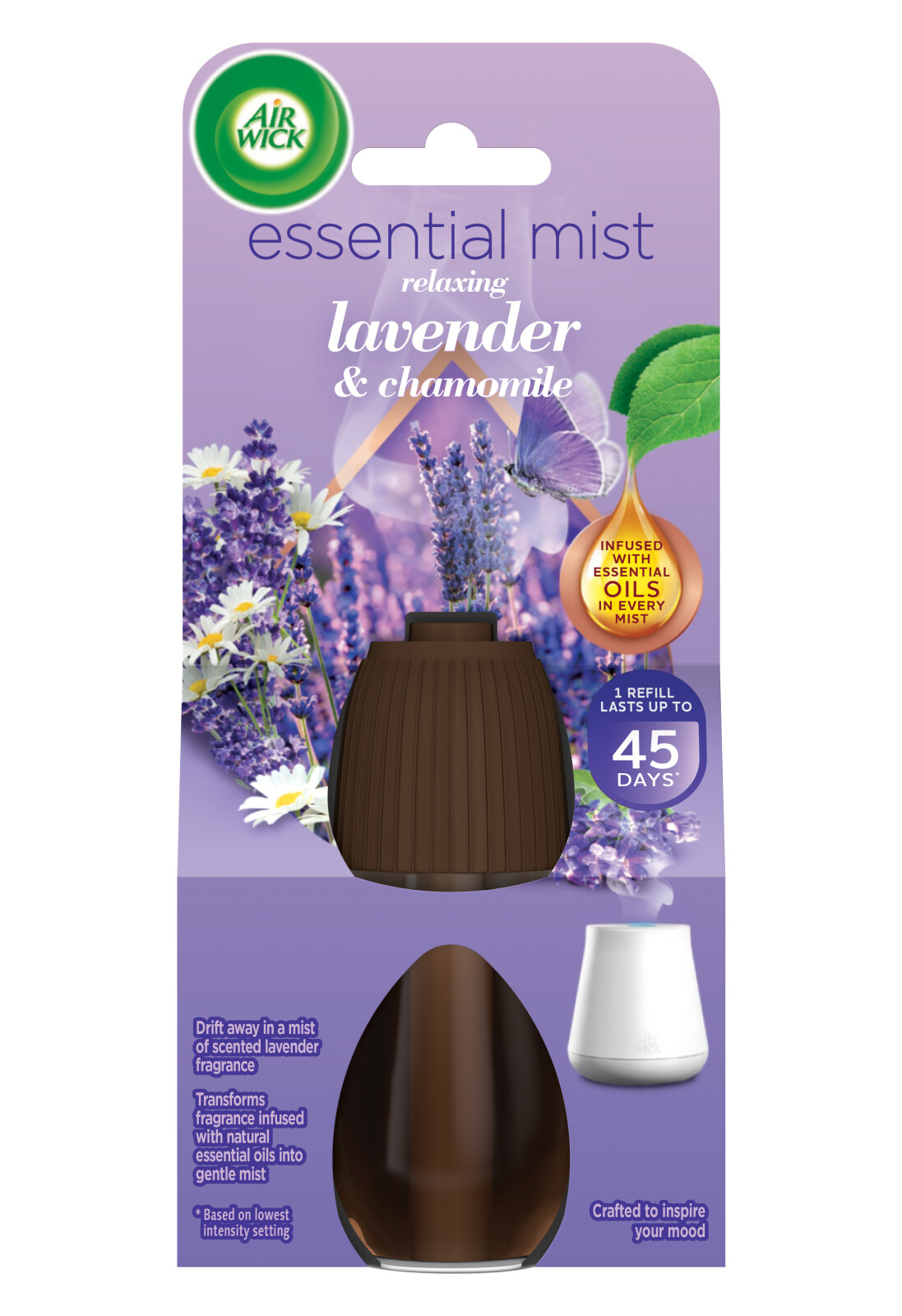 Lavendeldoftande refill för Airwick Essential Mist luftfräschare. Maskinen förvandlar doften som innehåller eteriska oljor till en mild dimma.