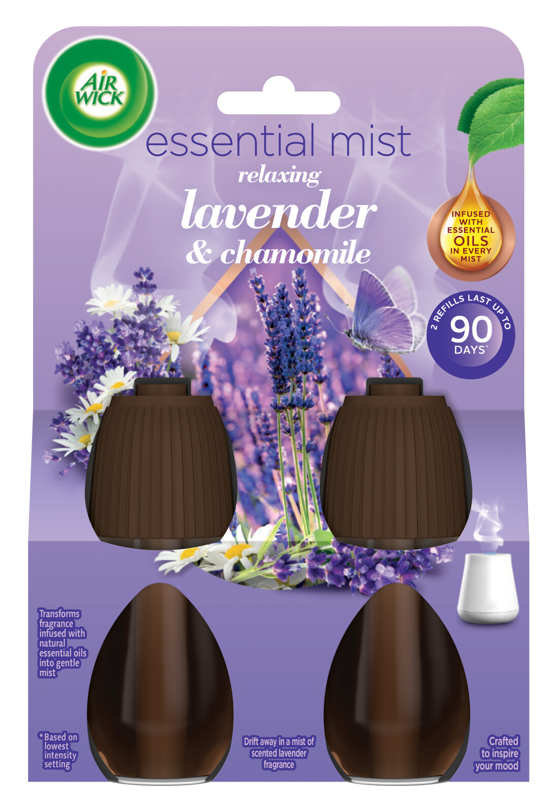 Lavendeldoftande refill för Airwick Essential Mist luftfräschare. Maskinen förvandlar doften som innehåller eteriska oljor till en mild dimma.