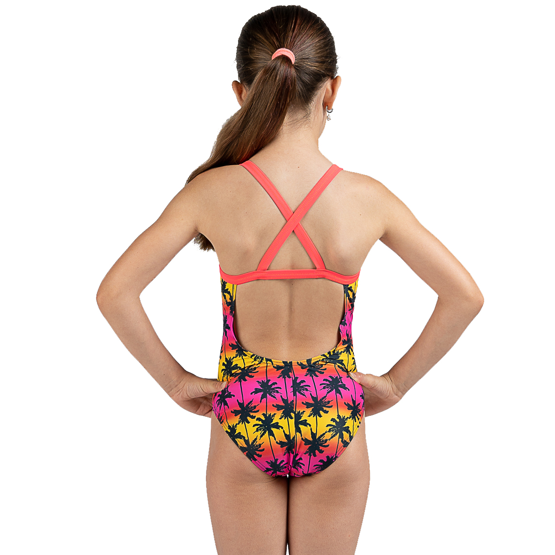 Baddräkt med snyggt palmmönster, designad för både träning och lek i vattnet. Specialdesignade axelband för att hålla skulderbladen fria vilket möjliggör bekväm simning.