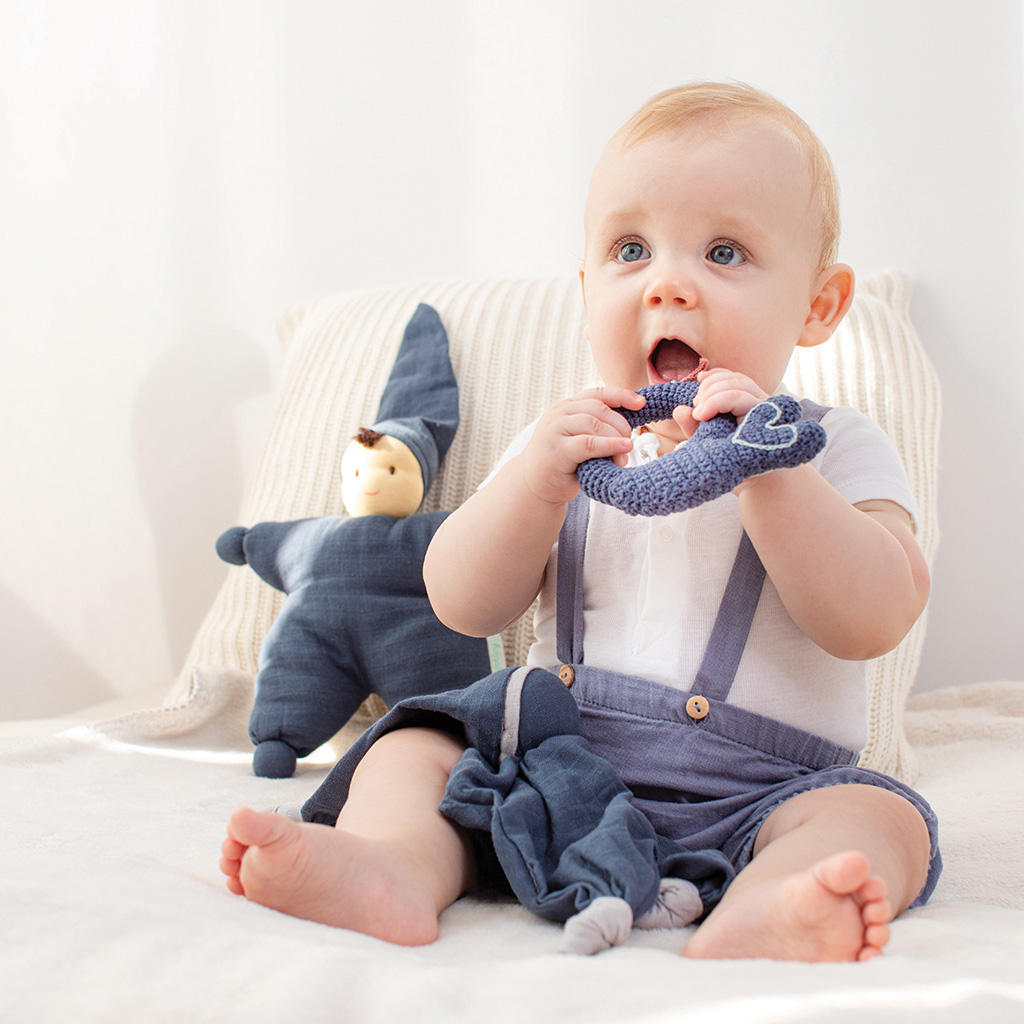 Vår virkade skallra är tillverkad av 100% ekologisk bomull, vilket garanterar en säker och miljövänlig produkt fri från skadliga kemikalier. Fyllningen består av 100% PLA, ett biologiskt nedbrytbart material framställt av majsstärkelse, vilket bidrar till en hållbar framtid för vår planet.