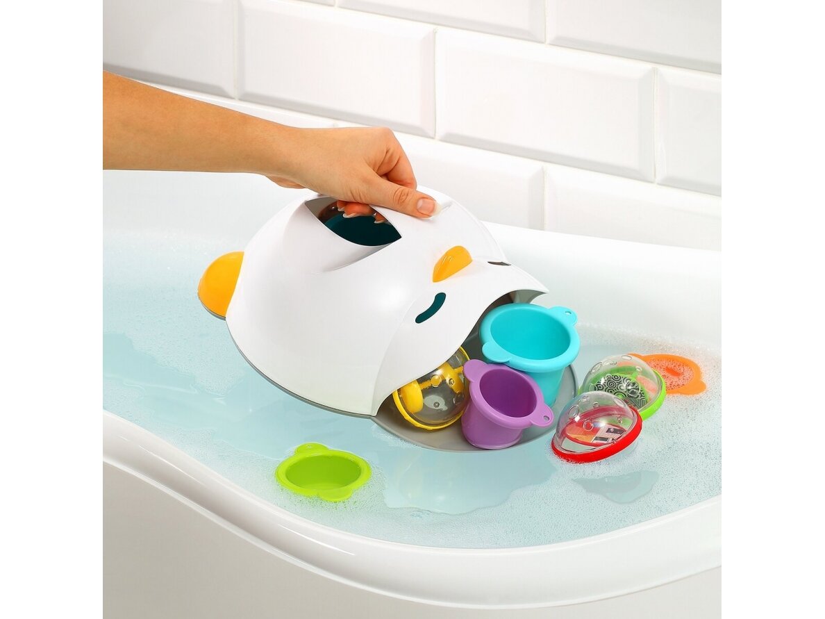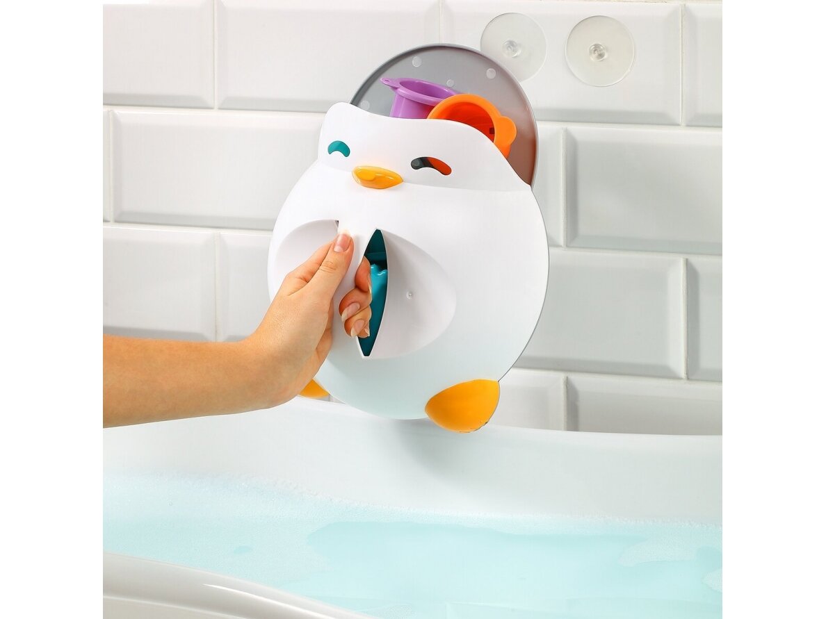 Badleksakshållaren i form av en söt pingvin är en perfekt kombination av en leksak för barnet och ett praktiskt föremål för föräldern. När barnet badar kan barnet ha kul, plocka fram leksaker och skvätta vatten med skum. Efter badet kan leksaker sköljas och förvaras i hållaren som bekvämt kan hängas på tork med de medföljande sugkopparna. Hålen i behållaren underlättar torkning av leksaker.