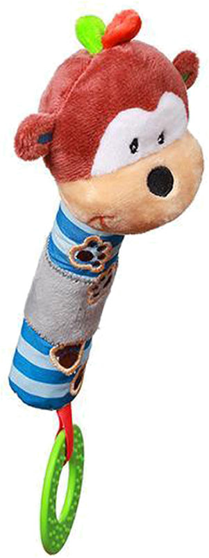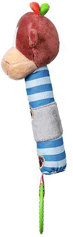 En mjuk, pipande leksak, vars kläder har olika texturer. En färgglad bitring och en greppvänlig kropp utvecklar kognitiva färdigheter och kan bli den första bästa lekkamraten för varje barn. Utvecklar den visuella, auditiva och motoriska koordinationen. Ljudet väcker barnets intresse och lär ut orsak och verkan relationer. Hjälper bebisar att träna sina motoriska och manuella färdigheter (gripa tag, gå från en hand till en annan. Elastisk bitring lugnar irriterat tandkött under tänder.