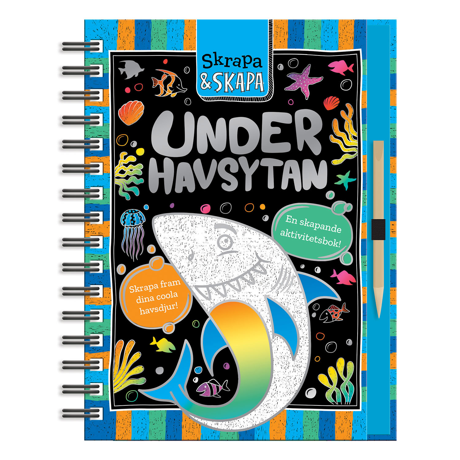 Genom att använda den medföljande träpinnen på specialsidorna skrapas och färgläggs allt spännande under havsytan.