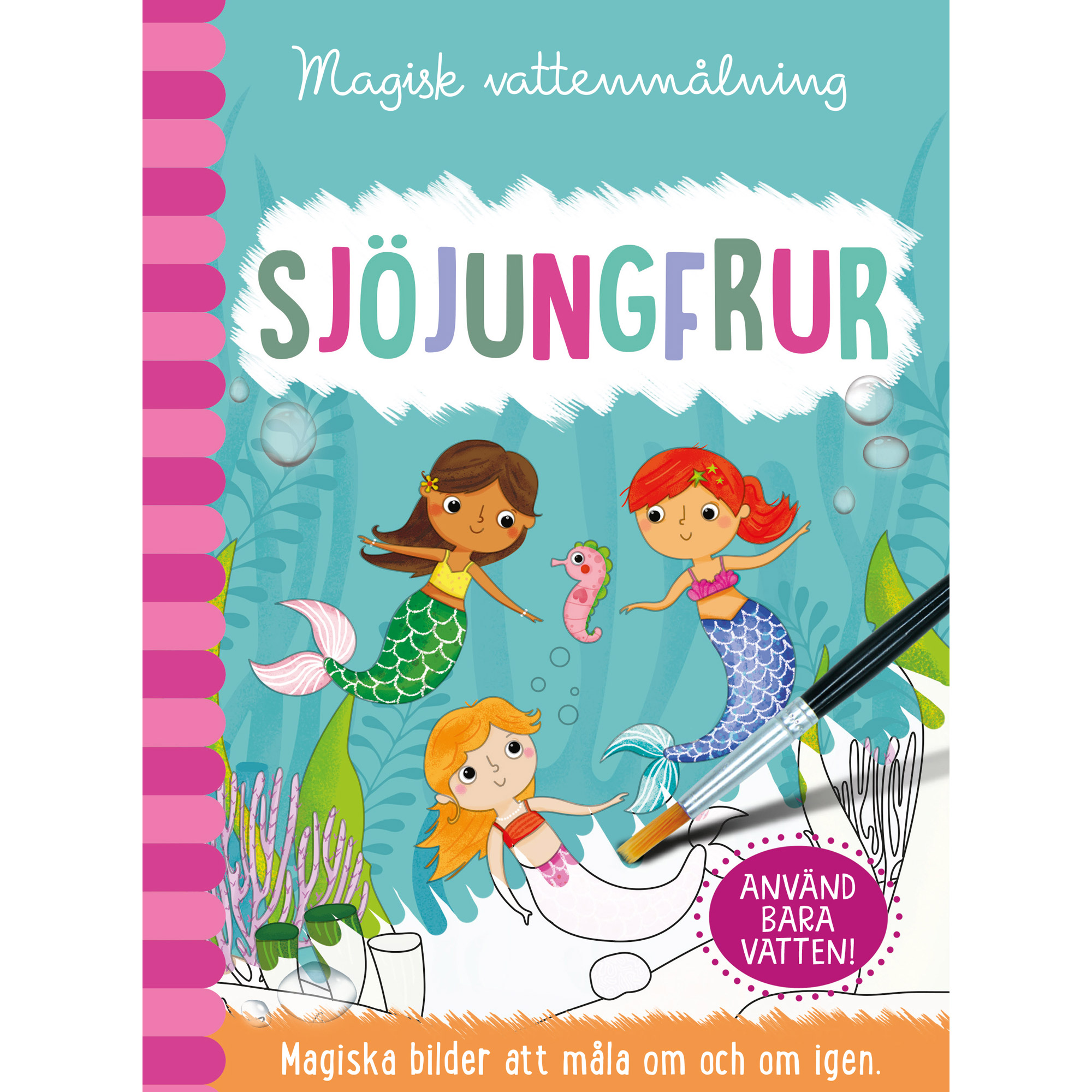Upptäck en magisk värld under havsytan! Med denna kreativa vattenmålarbok kan barn skapa färgglada sjöjungfrubilder – helt utan kladd. Doppa penseln i vatten och se färgerna träda fram som genom ett trollslag. När sidorna torkat kan de målas igen och igen. Boken är fylld med vackra illustrationer, spännande fakta om sjöjungfrur och tomma sidor där barn kan öva sina nya målarfärdigheter.