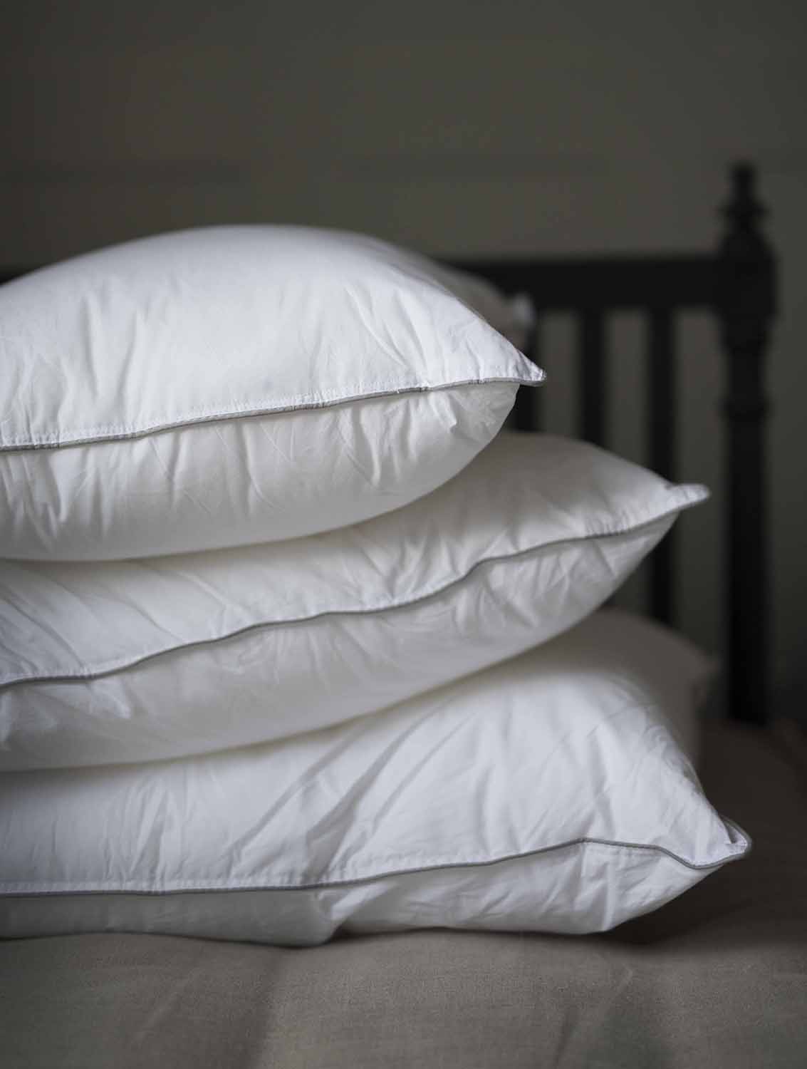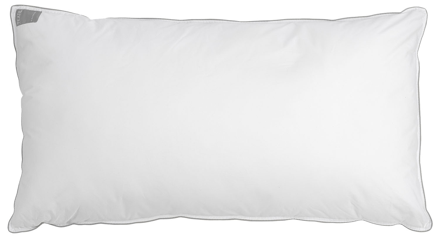 Textilgruppen kudde i slitstark bomullscambric med grå passpoal runt om. Kudden är extra lång och har en fyllning av 900 gram hålfiber som ger den rätta hotellkänslan. Kudden finns i flera olika mått.