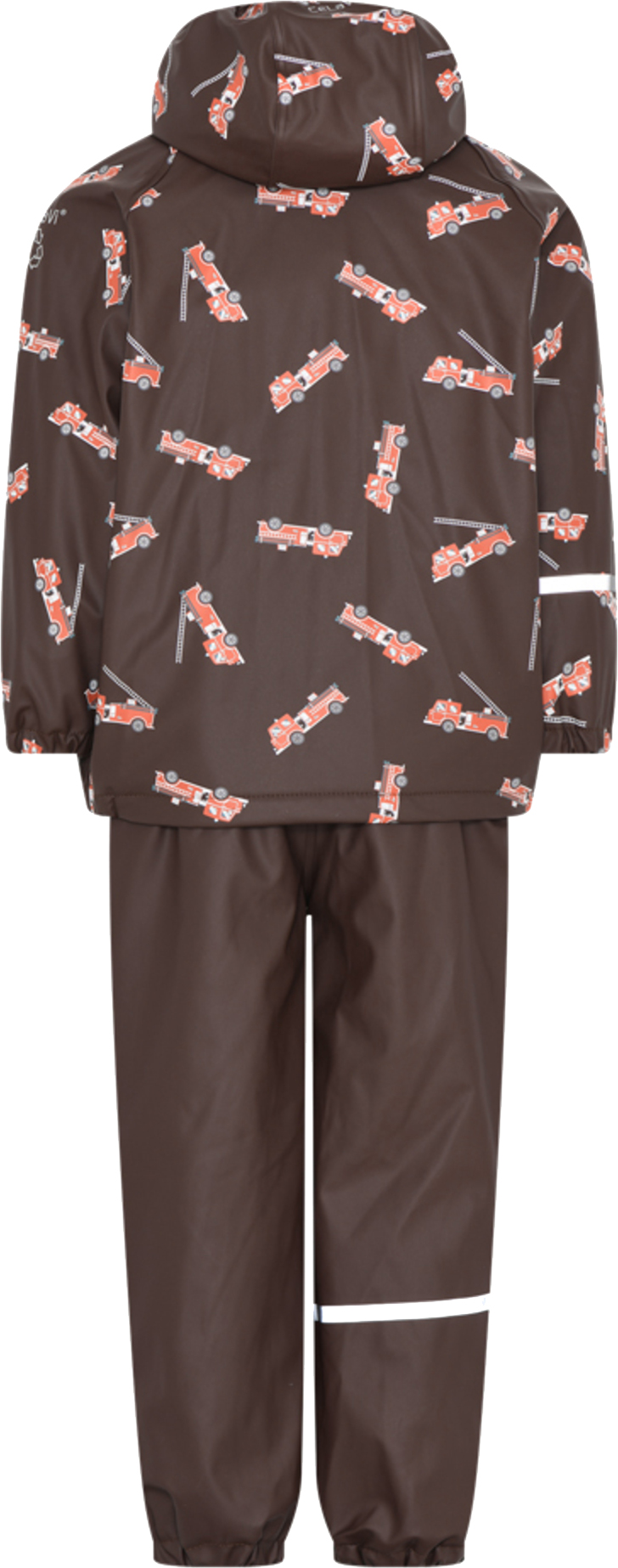 PU regnkläder med fleecefoder i slitstarkt material från CELAVI. Tillverkad av delvis återvunnet material. Regnkläderna är vattentäta med ett testat vattenpelartryck på 10 000 mm.Setet består av en regnjacka och regnbyxor. Upp till och med storlek 104 är regnbyxorna gjorda som byxor med justerbara hängslen och plastspänne framtill. De kan stängas på sidan med en bekväm tryckknapp. Från storlek 110 och uppåt är byxorna gjorda som byxor med resår i midjan. Båda versionerna har justerbara elastiska fotremmar som kan stoppas under stövlarna så att de inte kryper upp på benet. Regnjackan öppnas framtill med en kvalitetsdragkedja med hakskydd och dubbel vindstång, som stänger utsidan med praktiska knäppningar. Hakskyddet ser till att dragkedjan inte stör under hakan. Jackan har avtagbar huva och resår i slutet av ärmarna. Både jacka och byxa har mjukt fleecefoder och reflekterande detaljer. Det finns en namnbricka inuti.