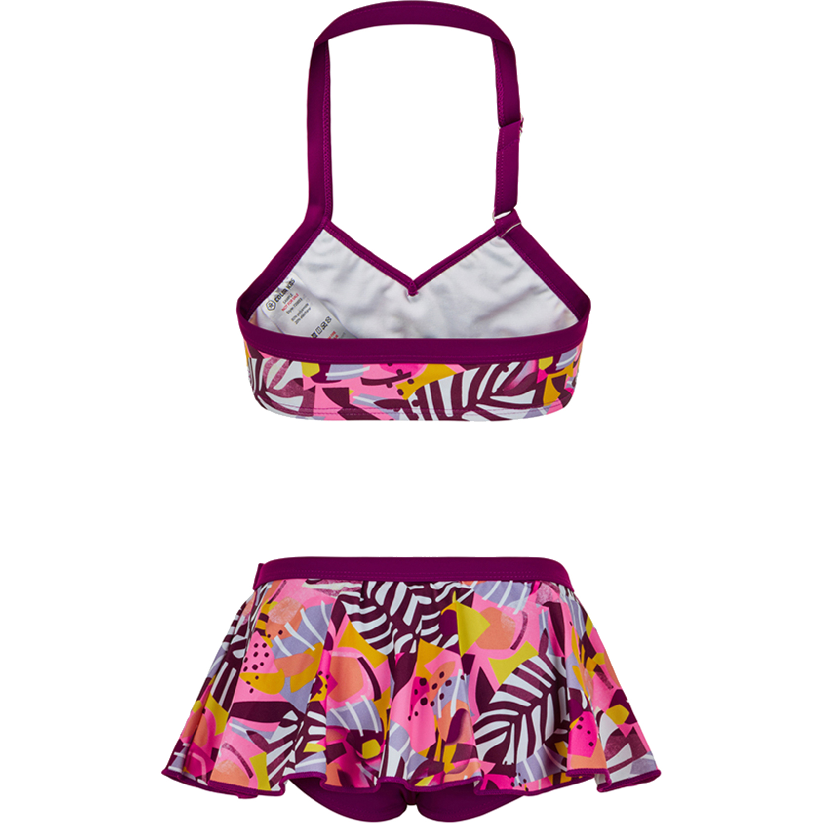 Söt bikini med mer tjejiga detaljer. Bikinitoppen har volang vid V-ringning och en justerbar rem runt halsen. Bikinitrosorna har kjolar påsydda. Bikinin har ett all-over tryck.