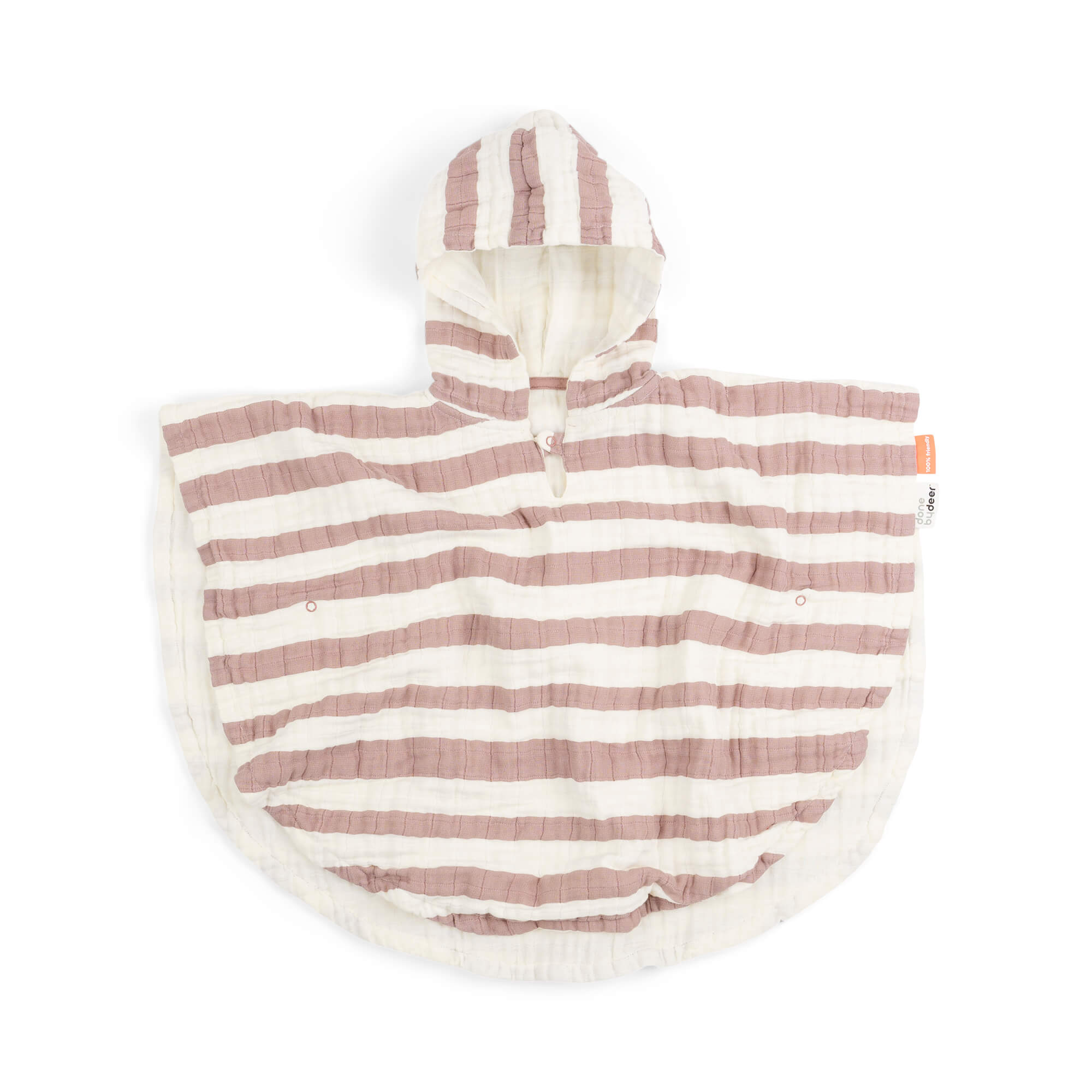 Badponchon med coola ränder är perfekt att mysa i efter badtid eller att ta med när man ska ut på strandäventyr. Den mjuka ponchon är gjord av ekologisk bomull i flera lager som är lätt och smidig på huden.