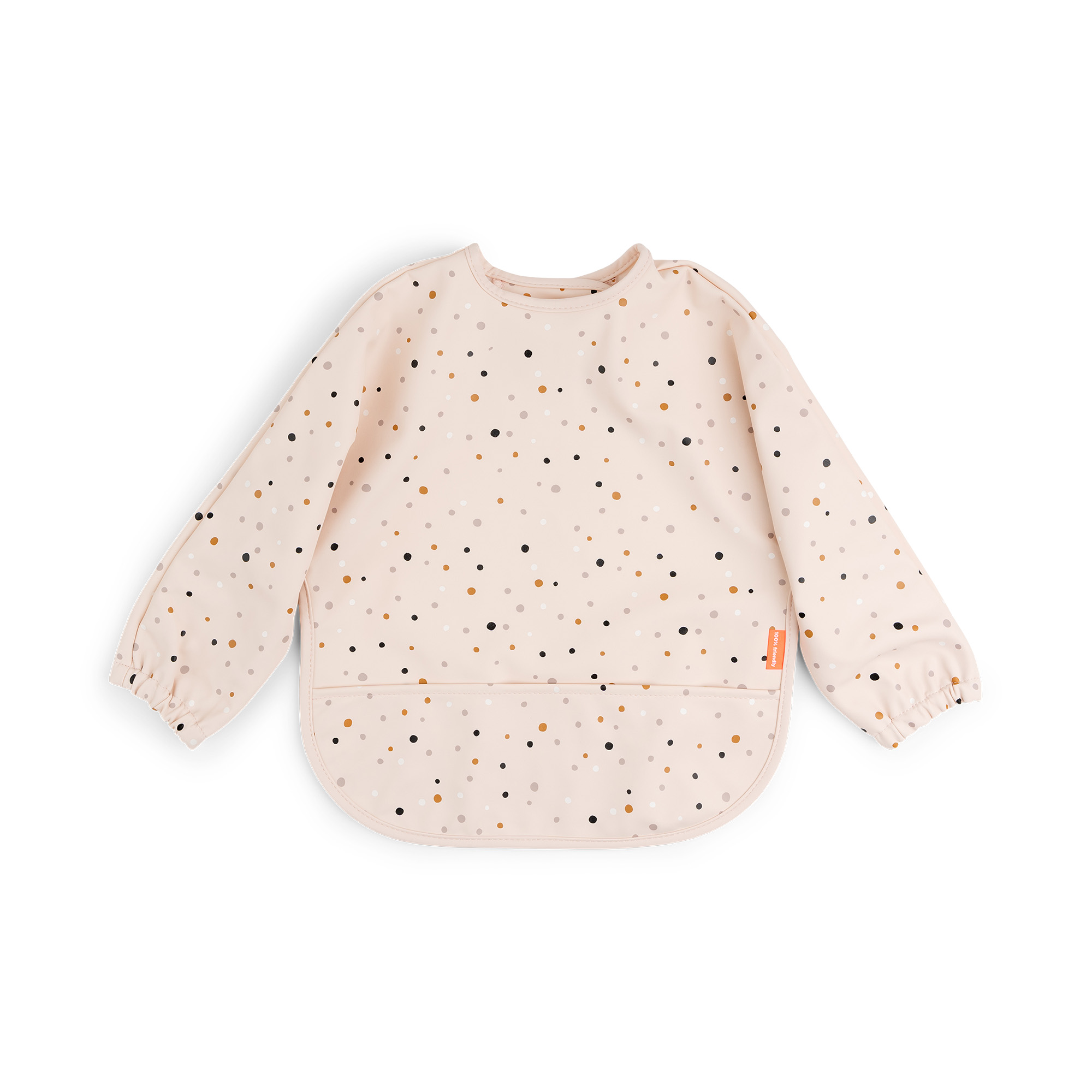 Den söta puderhaklappen är täckt med Happy dots i mjuka färger.