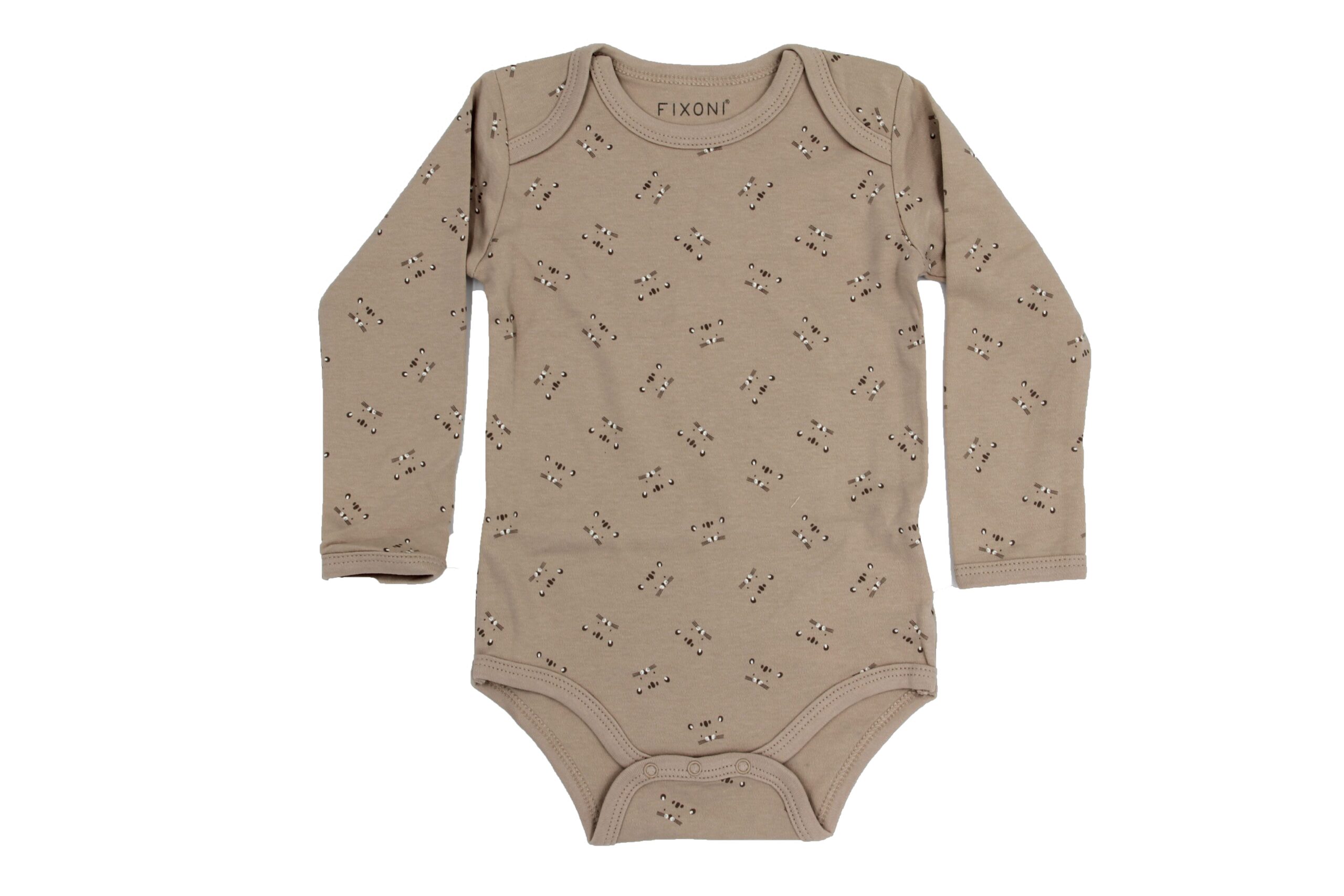 Långärmad kroppsstrumpa med all-over-tryck i 100 % bomull från FIXONI. Bodystrumpan har fastsydda fötter, mjuka ribbade kanter vid öppningarna och stängs med tryckknappar mellan benen. Amerikansk urringning gör det lätt att ta av kroppen nedåt i situationer där det är olämpligt att lyfta den över huvudet. Certifierad enl. till STANDARD 100 av OEKO-TEX® cert. Nej. SHGO 098029 förtroende för textilier