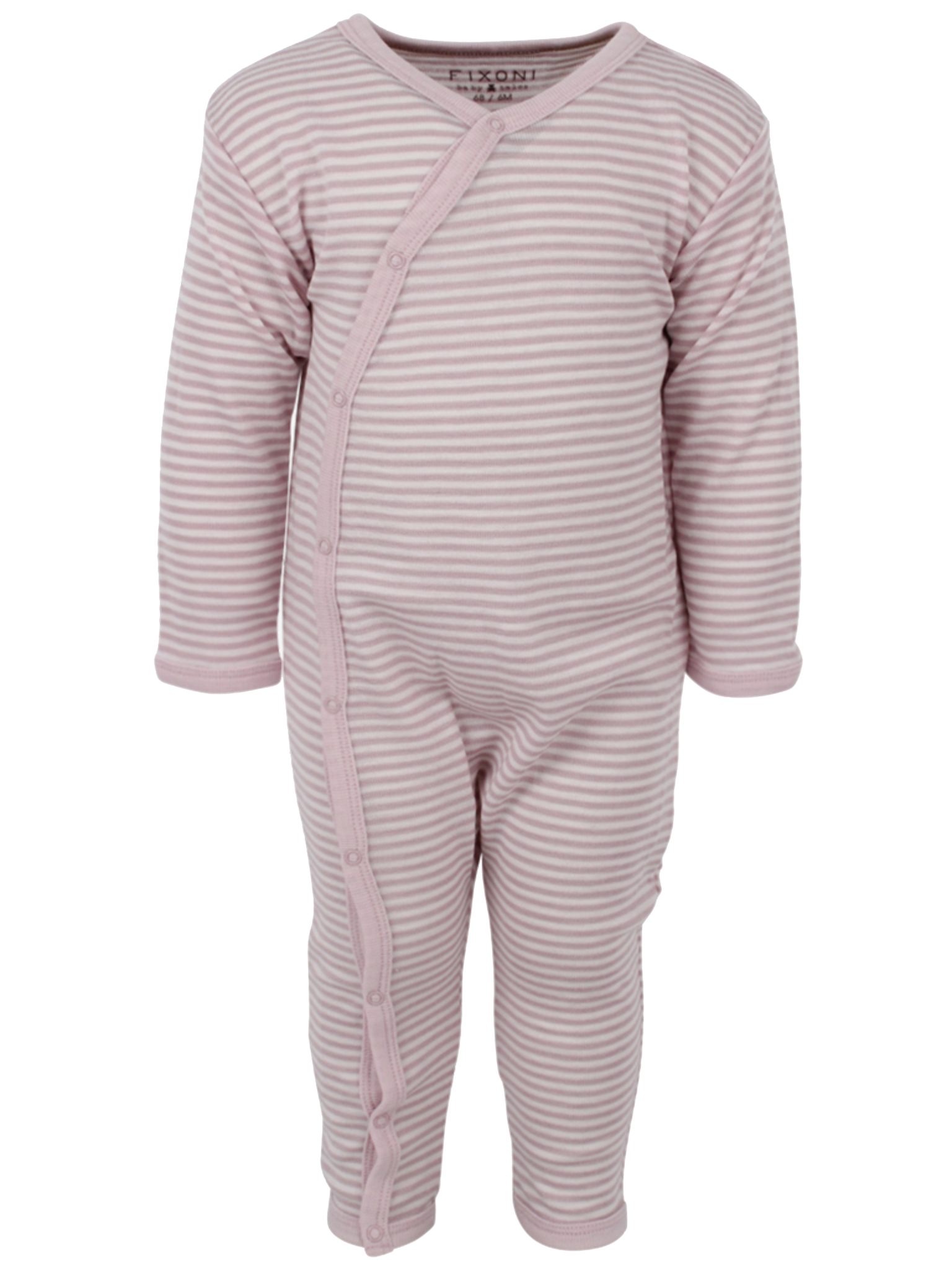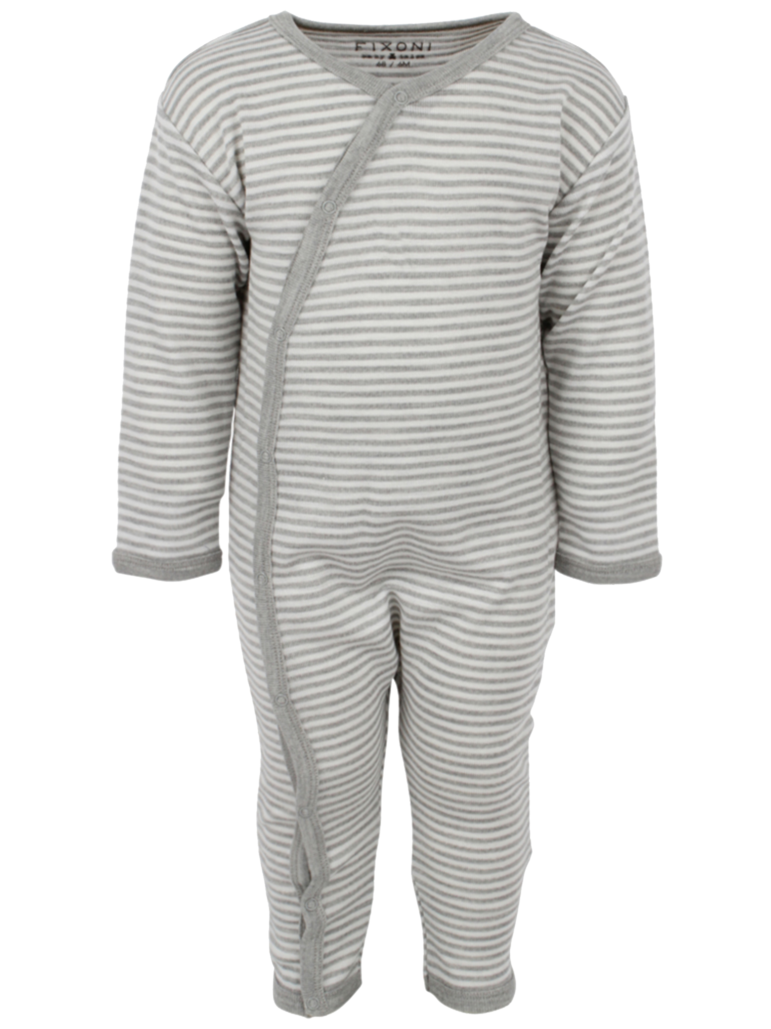 Söt långärmad pyjamas med ränder från Fixoni. Dräkten är tillverkad i 85% ull och 15% siden vilket gör den väldigt mjuk och skön att bära.