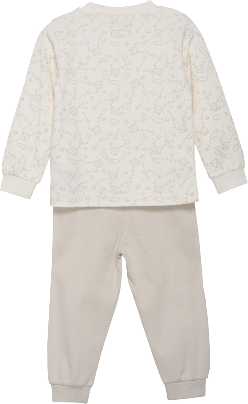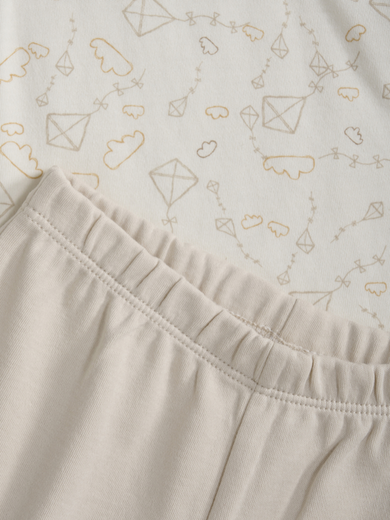 Pyjamasset med enfärgade byxor med resår i midjan. Blusen är all-over-print och ribbstickad runt handlederna. Jag stängs med tryckknappar på ena axeln. Certifierad enligt STANDARD 100 by OEKO-TEX® cert. no SH020 156011 TESTEX, förtroende för textilier