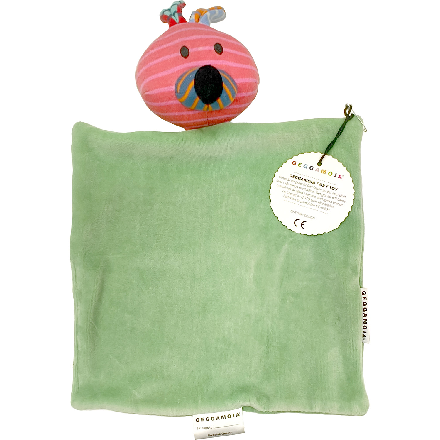 Framtagen från återvunnen GOTS-certifierad bomull, med svensk design från favoriten Geggamoja. Denna gosiga snuttefilt har även huvudet från ett gulligt gosedjur som tittar upp över kanten så det blir en kombinerad snuttefilt och gosedjur.