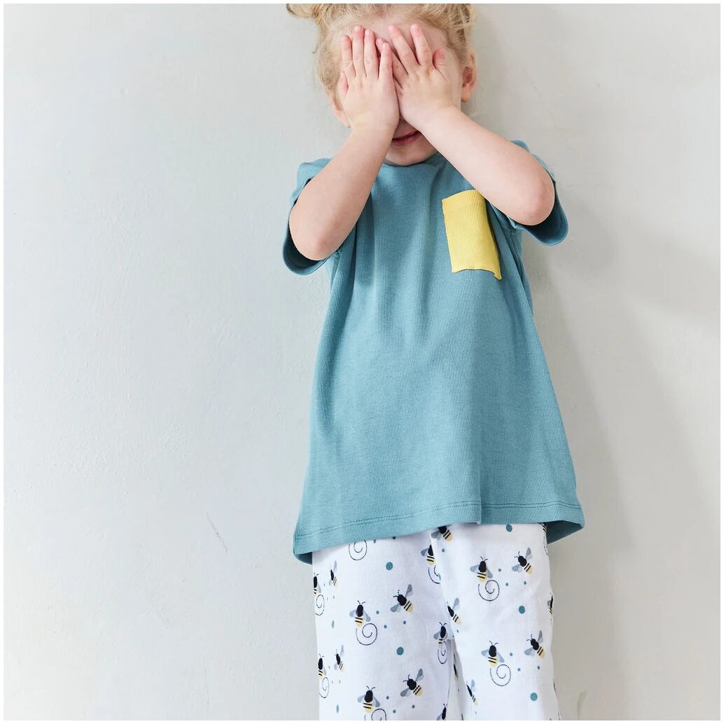 Tvådelad pyjamas med korta ben och ärmar. Breda mjuka muddar i midja och benslut. Tröjan är grön och byxorna har små bin på sig.