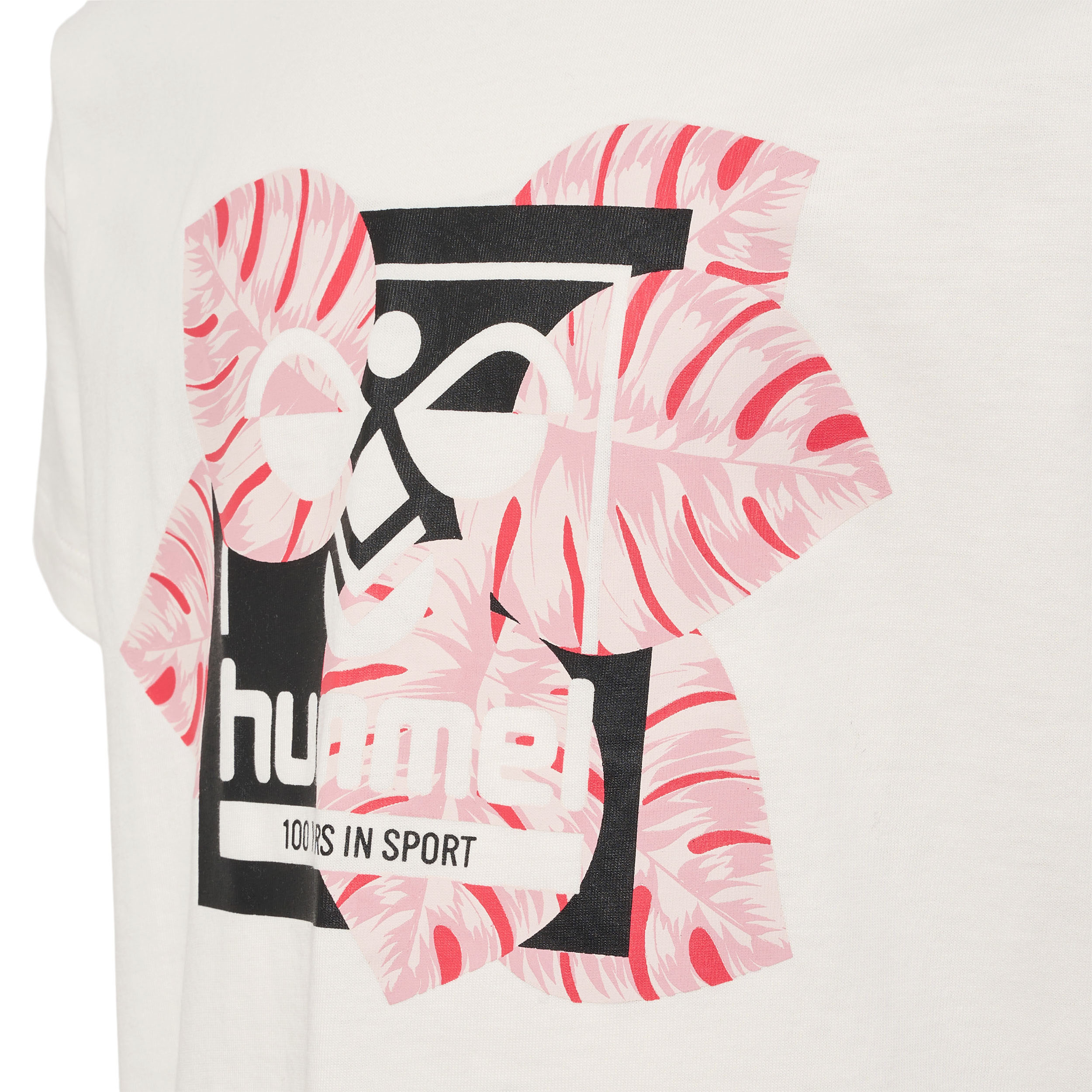 Upptäck hmlAlexis T-shirt från hummel®, en T-shirt som kombinerar modern design med hållbarhet. Framsidan pryds av ett iögonfallande grafiskt tryck med Bumblebee®-logotypen, omgiven av ett lövmönster i två nyanser, vilket ger en distinkt och stilfull look.