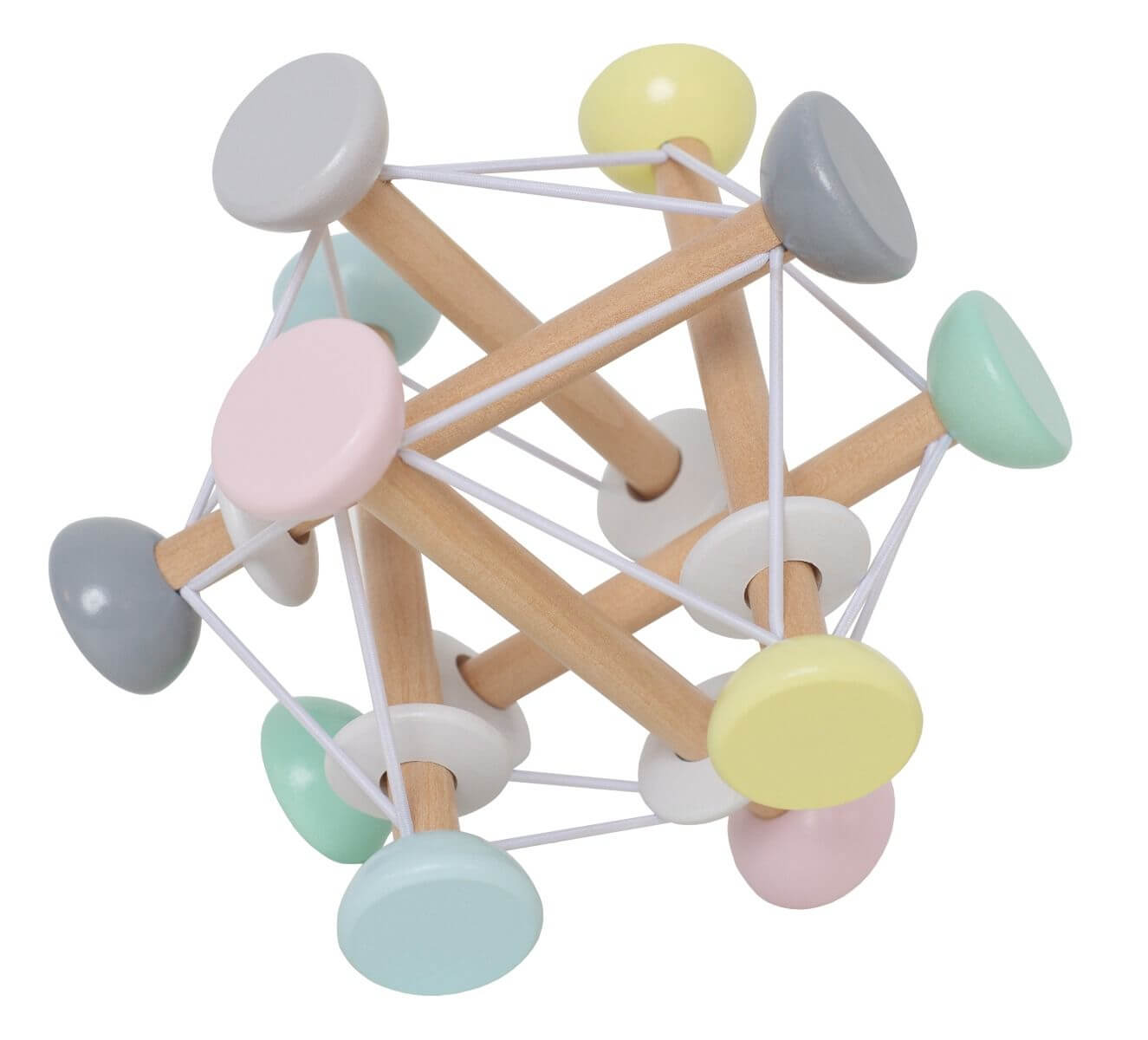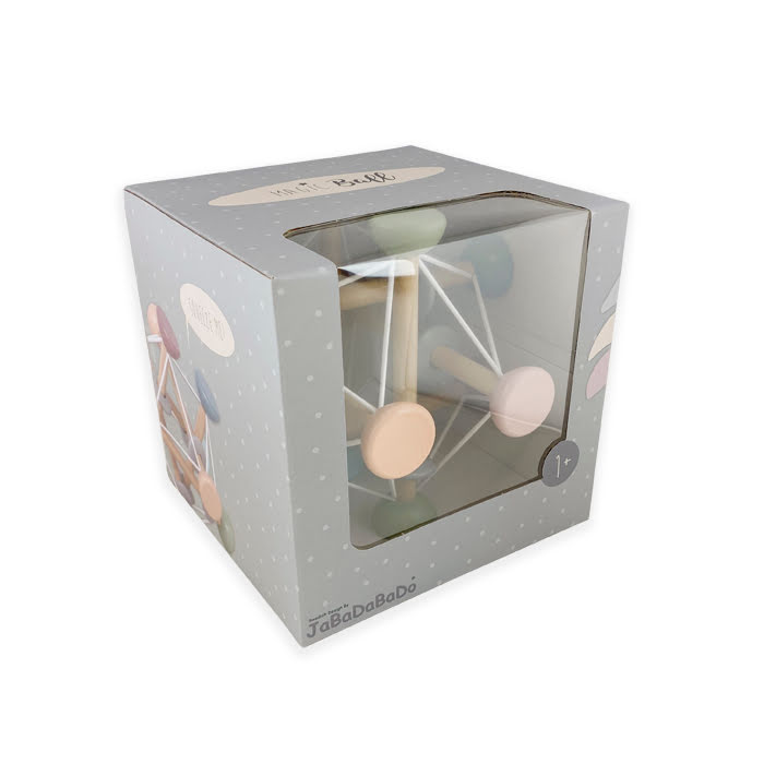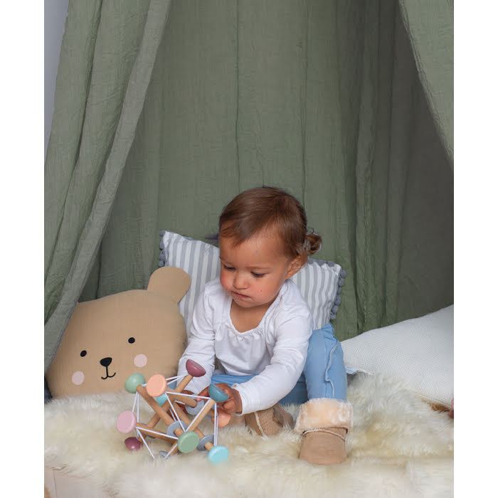 En aktivitetsleksak för de minsta barnen som stimulerar många olika sinnen. På de mjuka gummibanden sitter pärlor i trä som går att snurra och dra i. De håller även samman träpinnarna som går att trycka ihop eller dra ut. De många härliga färgerna ger mycket att titta och pilla på för ett litet barn!