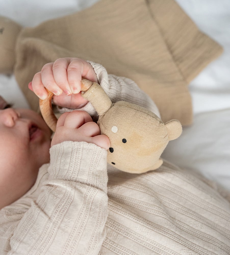 För att främja utvecklingen av bebisens motorik och sensoriska färdigheter inkluderar presentsetet en charmerande babyskallra i textil med ett säkert och greppvänligt trähandtag. Denna noggrant designade skallra stimulerar både syn och hörsel, och introducerar de minsta till en värld av ljud och rörelse på ett lekfullt sätt.