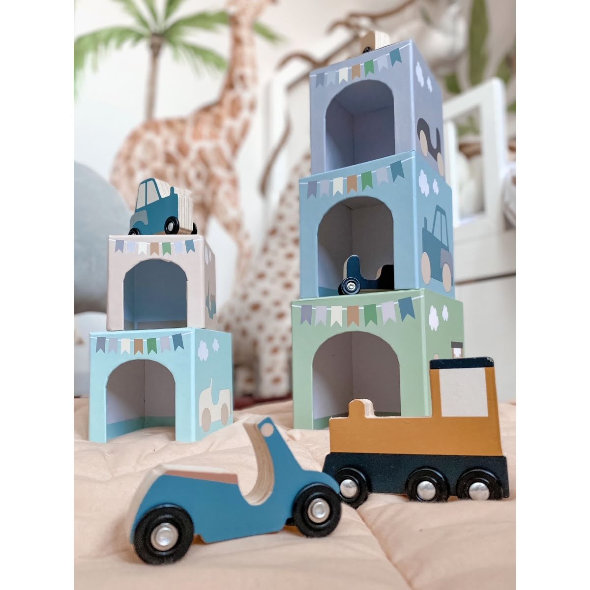 Ett set med 5 färgglada stapelbara kuber i hård papp numrerade med siffrorna 1-5. Varje stapelbar kub har två olika motiv samt en siffra.