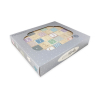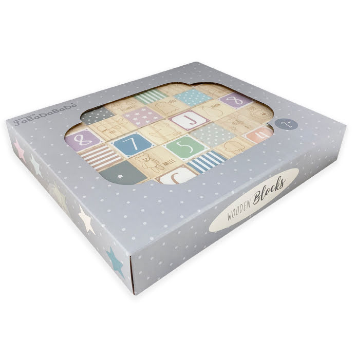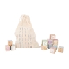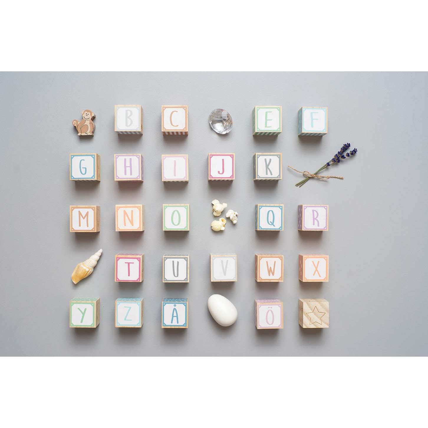 Klossar i obehandlat trä med svenska alfabetet. Stapla torn, bygg ord eller bara använd dem som fin dekorativ inredningsdetalj i barnrummet. Klossarna har bokstäver på en sida och mönster på en sida och siffrorna 1-9 och roliga figurer på de övriga två. Träfärgen kan variera något på grund av träets naturliga färgskiftningar. Innehåller 30 klossar.