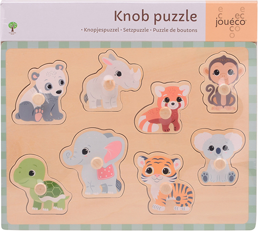 Detta stora träpussel för de yngsta är ett pussel med små handtag så att barnet enkelt kan ta tag i vart och en av de åtta bitarna i handen. Vi har söta glada djur här: panda, tiger, apa, elefant, sköldpadda , noshörning, nallekoala. Det blir en kul utmaning för ditt barn att sätta bitarna på rätt plats.