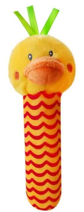 Mjukisdjur tillverkat i mjuk plysch. Har formen av en gullig anka som är lätt att greppa med handen. Pipljud kommer när barnet trycker på den.