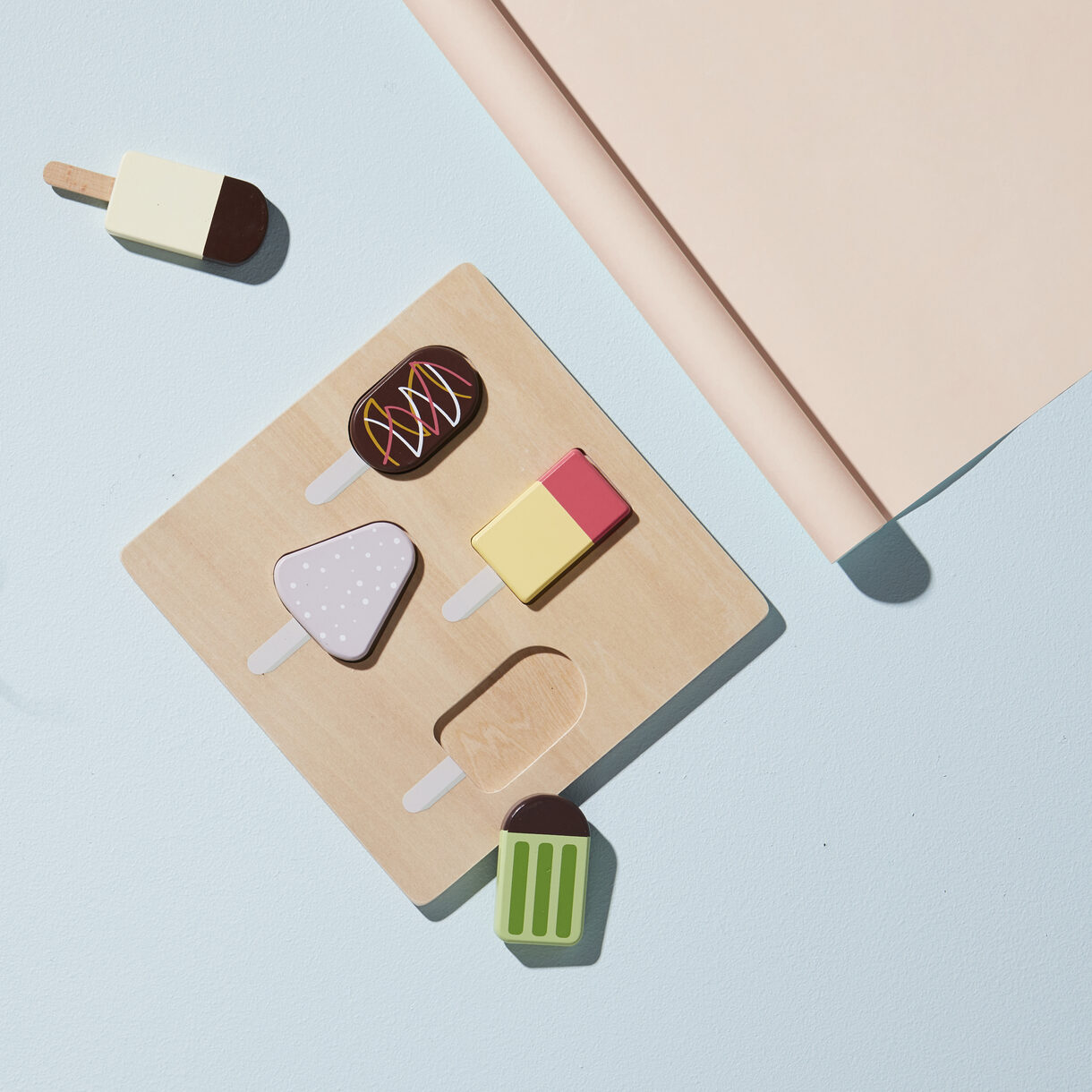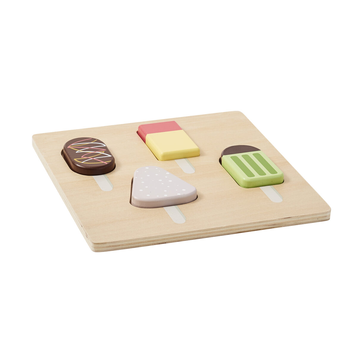 Ett pussel med 4 färgglada glassar i plywood och bok.