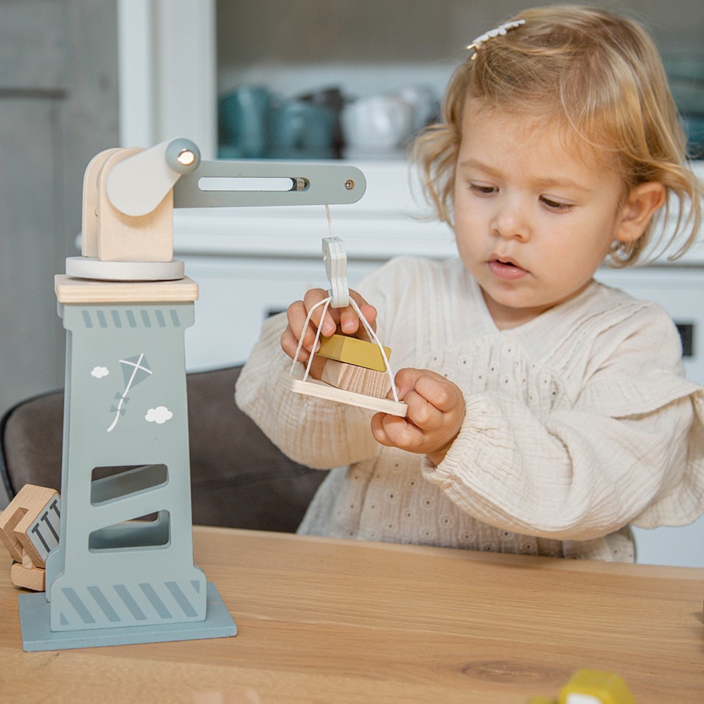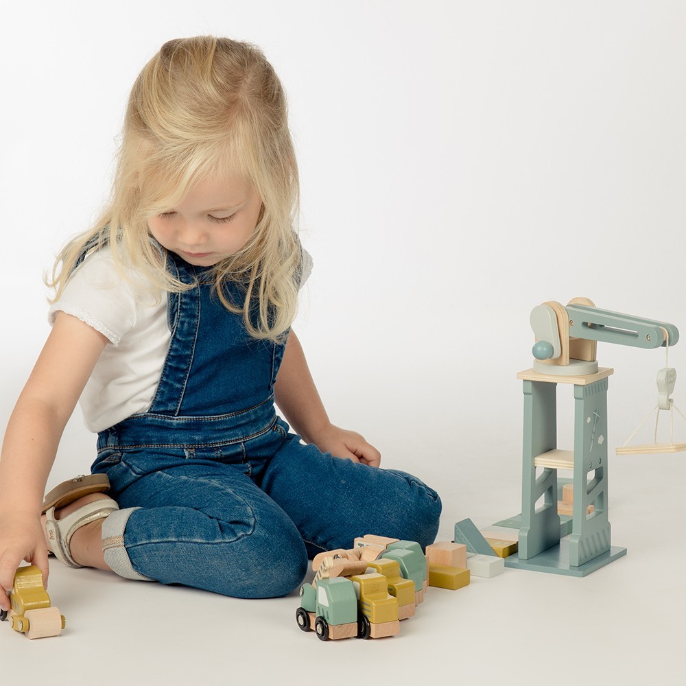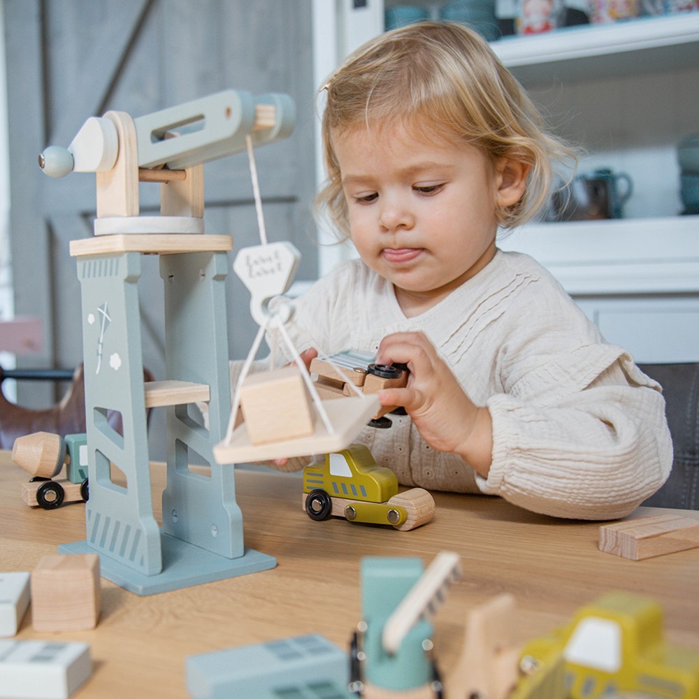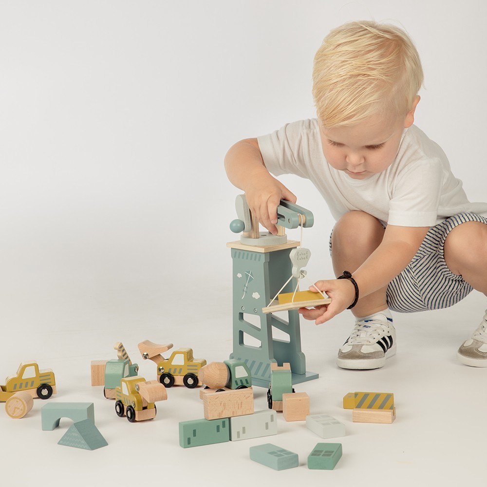 Lyftkranen har ett roterande huvud som kan snurra 360° och är utrustad med ett handtag för att lyfta och sänka tunga laster. Barnet kan använda lyftpallen och byggfordonen för att lyfta, leverera och organisera material på byggplatsen. Setet innehåller också byggklossar och vägskyltar, vilket inspirerar till timmar av lek och kreativt skapande.