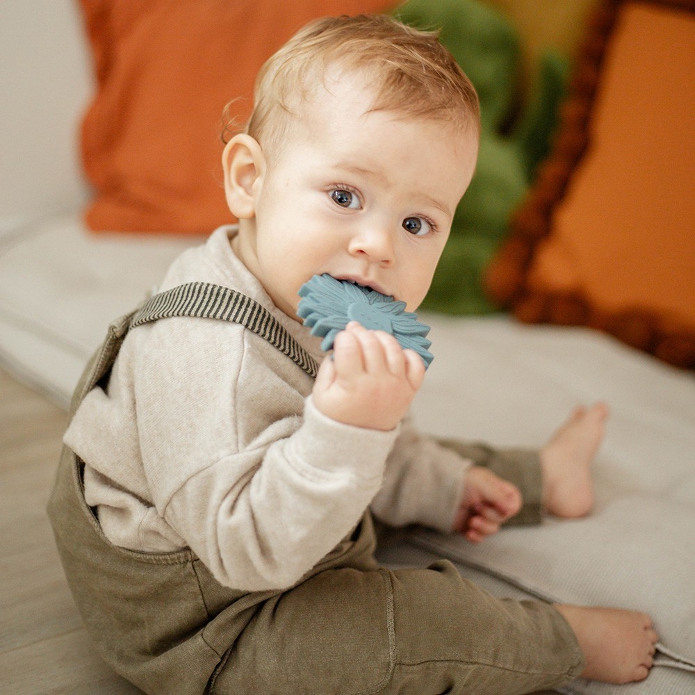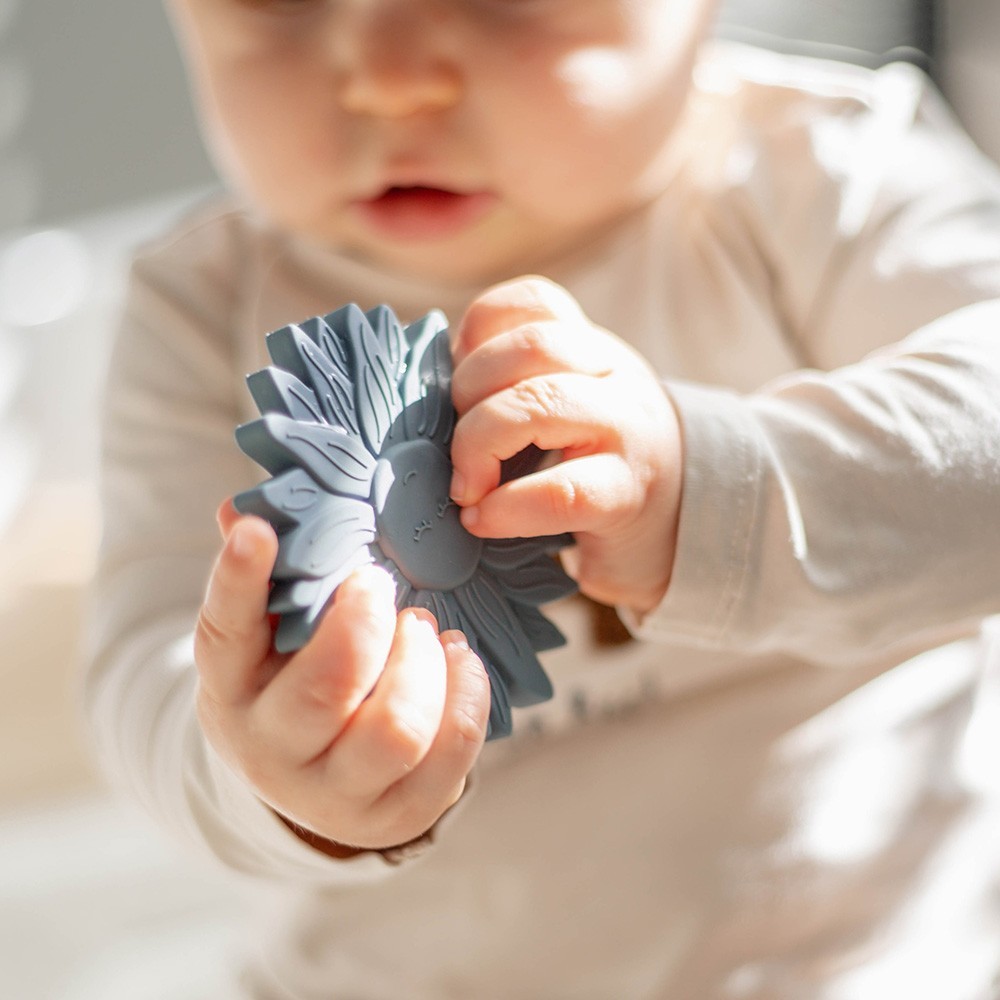 Label Labels charmiga bitleksak i form av en solros är designad för att ge lindring till ömt tandkött när de första tänderna börjar komma. Det mjuka silikonet masserar varsamt tandköttet samtidigt som leksakens form gör den enkel för små händer att greppa, vilket hjälper till att träna barnets finmotorik.