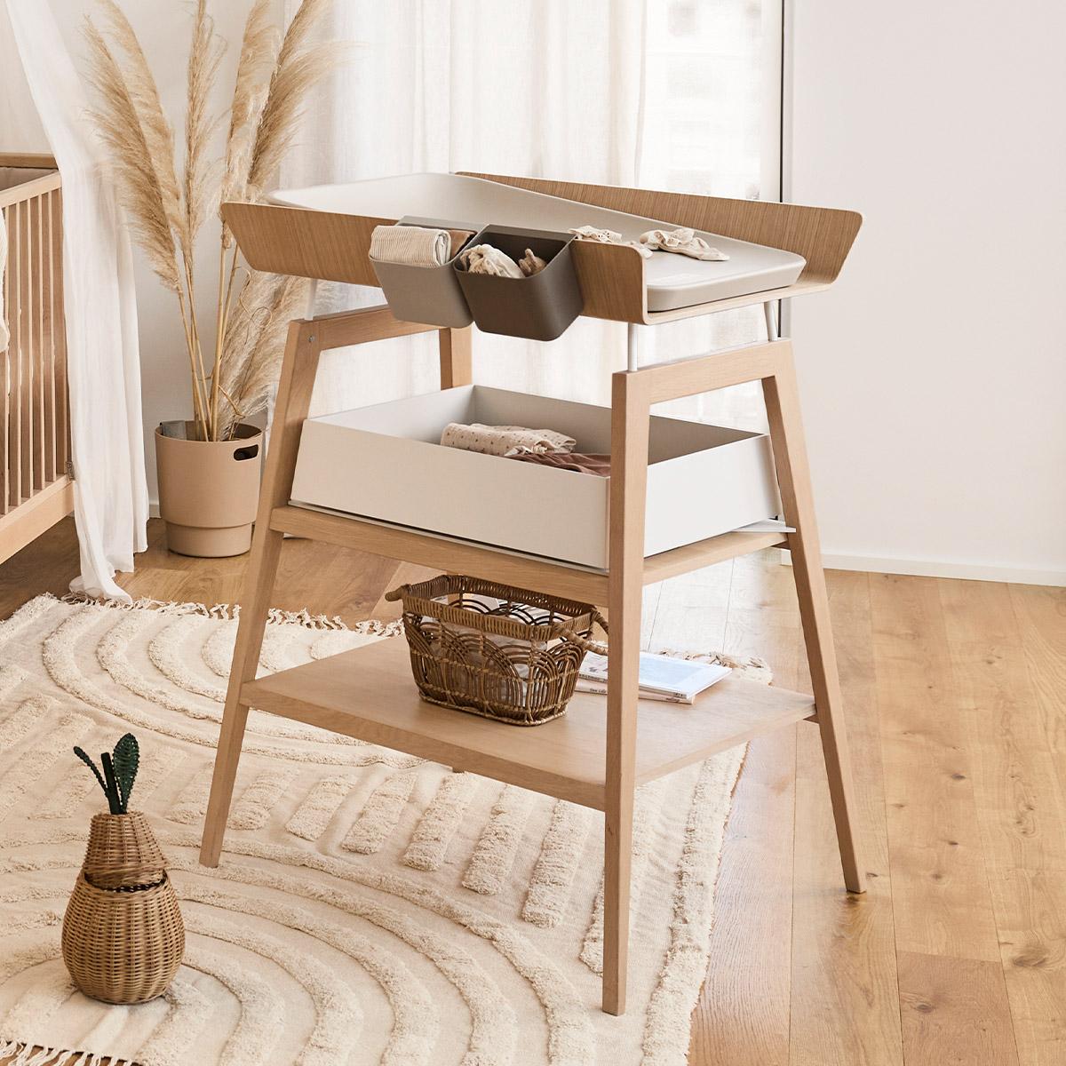 Skötbordet är utrustat med två hyllor som gör att du har allt du behöver inom räckhåll, och för ytterligare förvaring kan en rymlig låda och praktiska Leander-organisatörer läggas till. Denna flexibilitet gör det enkelt att hålla ordning och struktur i din vardag.
