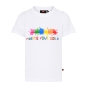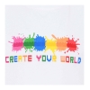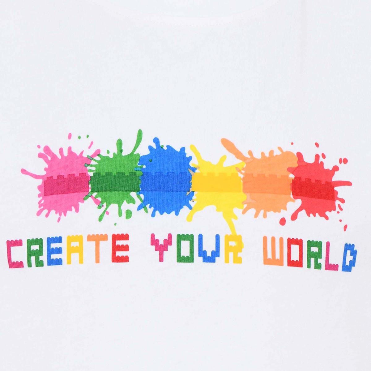 CREATE YOUR WORLD står det på bröstet på denna fina vita sommar-t-shirt för barn. Färgstänken i trycket stimulerar fantasin och understryker budskapet: Du ”mixar” och skapar din egen värld.