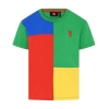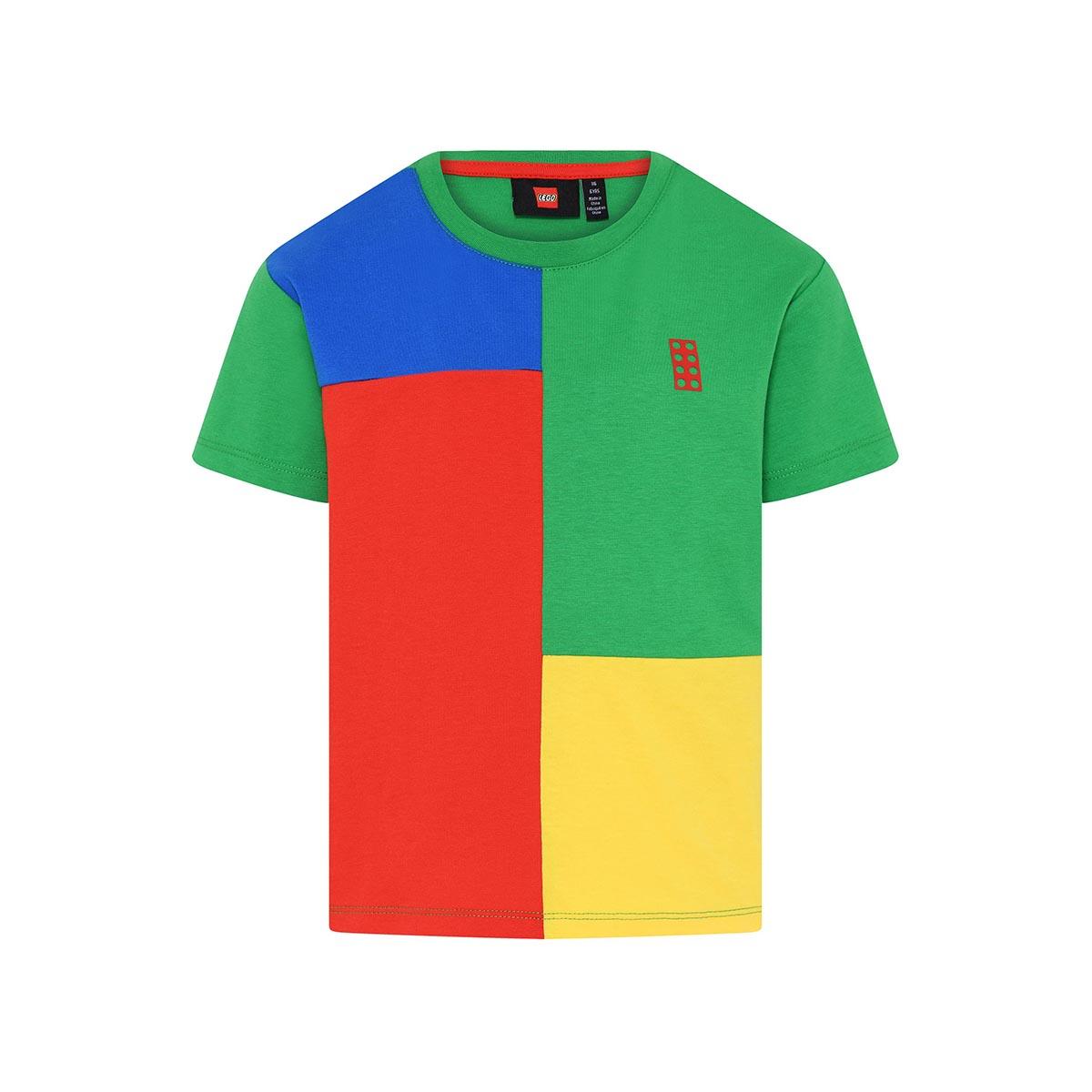 Rolig LEGO® barn-t-shirt gjord i en färgblocksdesign med några riktigt ikoniska LEGO-färger: grönt, rött, blått och gult. Färgerna är inte bara tryckta på tyget, utan t-shirten är gjord av material i olika färger.På bröstet finns ett litet rött tryck format som en tegelsten.Det finns en LEGO-logga i ena sidsömmen.