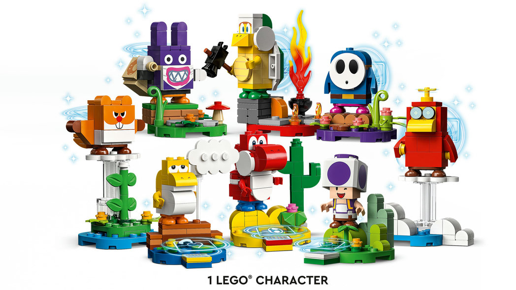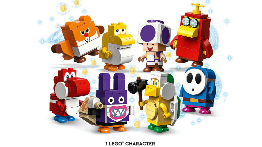 • 8 karaktärer att samla, bygga och leka med – Nabbit, Purple Toad, Hammer Bro, Waddlewing, Toady, Baby Yoshi, Red Yoshi och Blue Shy Guy