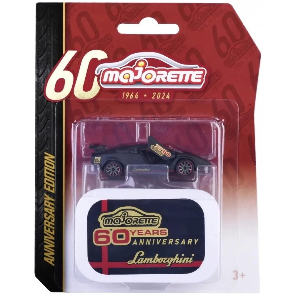 Ge plats för en riktig klassiker – den ikoniska Lamborghini Countach LP400 i elegant mattsvart utförande. Denna modell ingår i Majorettes exklusiva Anniversary Edition Deluxe Cars, framtagen för att fira 60 år av leksakshistoria (1964–2024).