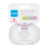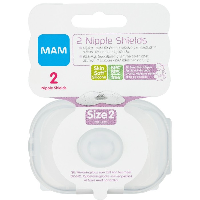 MAM Nipple Shields Size 2 är tunna, fjärilsformade amningsnappar som skyddar ömma bröstvårtor och underlättar amningen. Deras unika design möjliggör maximal hudkontakt mellan mamma och barn. Tillverkade i silkeslen MAM SkinSoft-silikon som känns naturlig och bekväm mot huden, med en lätt textur som släpper in luft för ökad komfort. Storlek 2 (Regular) passar de flesta och levereras i 2-pack med steriliseringsbox som kan användas i mikrovågsugn i 3 minuter. Nipple Shields är fria från BPA och BPS för trygg användning. Rekommenderas att rådgöra med barnmorska eller BVC innan första användning.