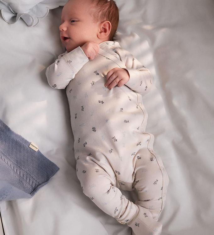 Långärmad omlottbody för enkel påklädning. Bodyn stängs med tryckknappar från halsen och längs med ena benet.
