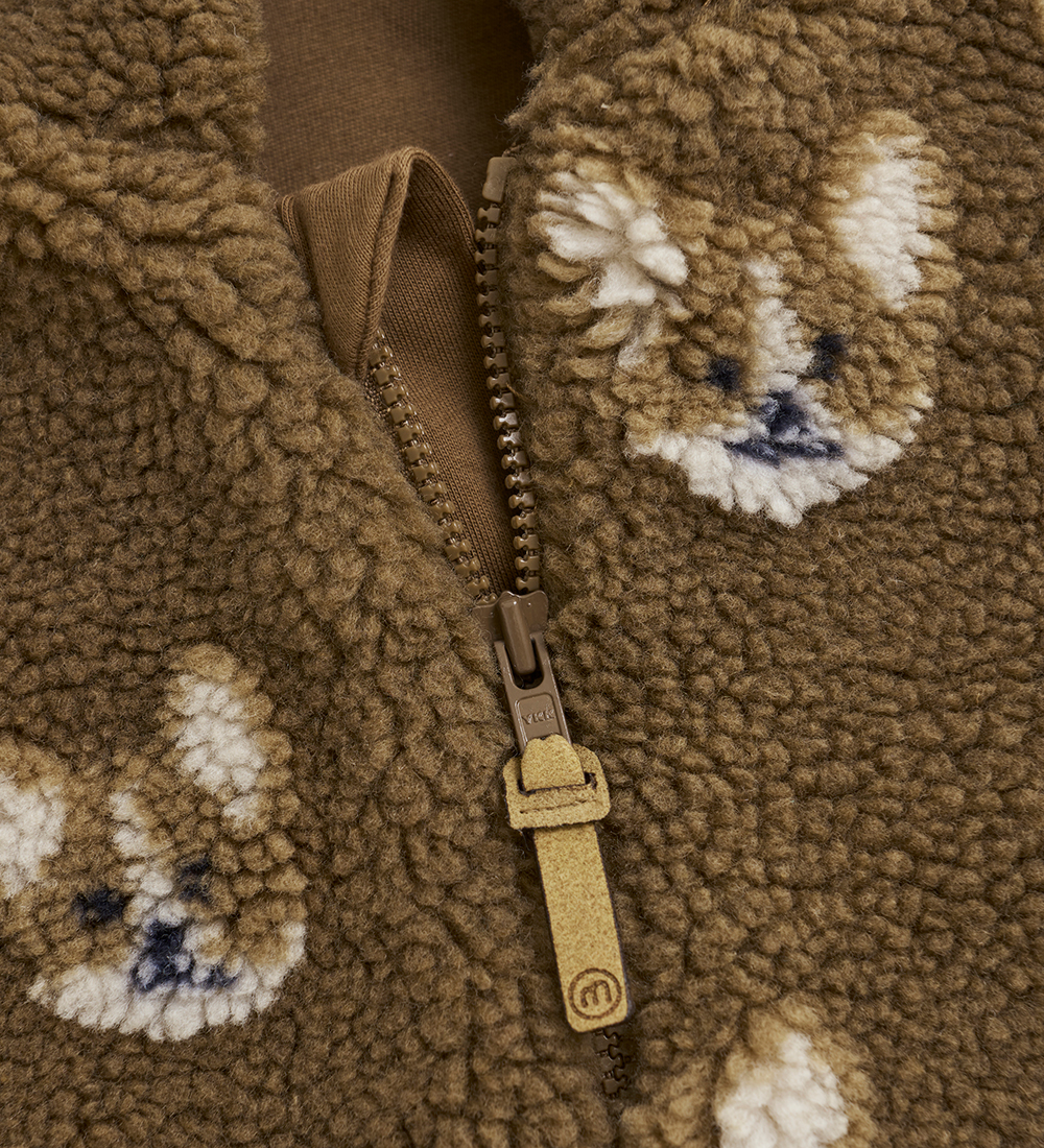 Denna härliga fleecejacka från Minymo är tillverkad i brunt teddyfleece med söta djurmotiv i ljusbrunt och vitt. Jackan har en fast huva och öppnas framtill med en dragkedja som har både hakskydd och en invändig vindslå för extra komfort. Insidan av jackan är fodrad med mjuk bomullsjersey i en enfärgad brun nyans, vilket ger extra värme och komfort under kyliga dagar.