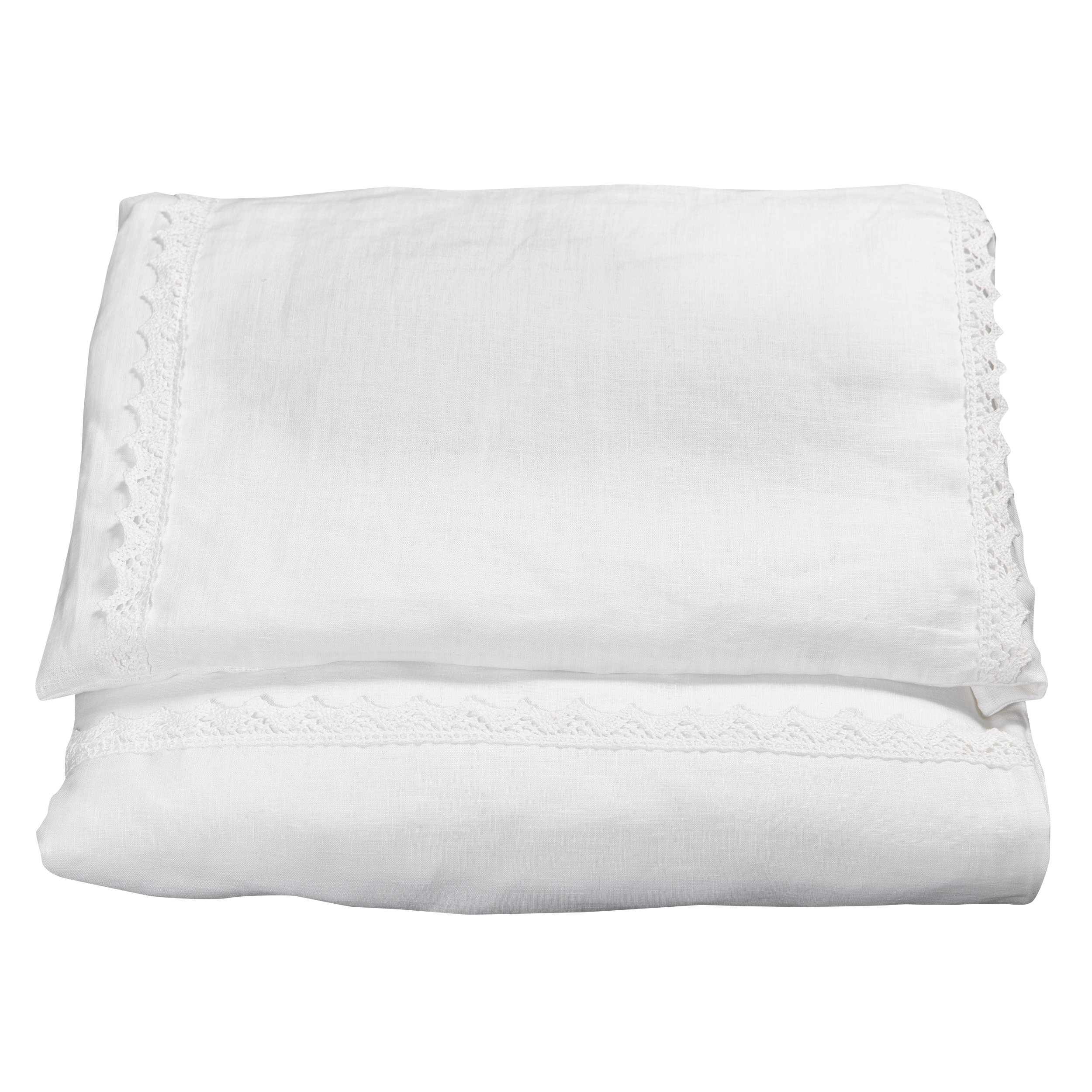 Påslakan och örngott för barn och baby – med vacker detalj av supersöt vit spets. Materialet är stentvättat lin av mjukaste kvalitet och även spetsen är av 100 % lin. All sömnad sker i Sverige.