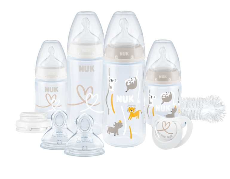 NUK First Choice+ Perfekt Start Set innehåller 4 st nappflaskor, extra dinappar i stl M, ett spillfritt lock till flaskorna, en My First NUK-napp och en flaskborste med praktik 2i1-funktion. Ett perfekt startset för barn 0-6 månader och en uppskattad present till blivande föräldrar. First Choice+ Temperature Control Bottle är en nappflaska med temperaturindikator. När indikatorn är blå har maten rätt temperatur, om den blir vit är maten för varm. Flaskan har en extra vid öppning vilket gör den lätt att rengöra. Anti-koliksystem förebygger att barnet sväljer luft när de äter. First Choice+ Teat är dinappar i extra mjuk silikon, naturligt formade efter barnets mun och påminner om mammas bröstvårta vid amning. NUK Open & Close System – öppna och stäng med bara en vridning. Ett spillsäkert lock som enkelt skruvas fast mellan NUK First Choice-nappflaskan och skruvringen med dinapp.My First NUK napp är ortodontiskt utformad för att passa det lilla barnets anatomi. Ovansidan av sugdelen lägger sig mjukt mot gommen, och undersidan lämnar plats för tungans naturliga sugrörelser. Eftersom den är smal och platt blir det knappt någon belastning på tänder eller käkar. Tack vare NUK Air System kan luften strömma fritt genom sugdelen vilket gör att nappen behåller sin form när barnet suger. Nappen kan snabbt och enkelt steriliseras i mikrovågsugn genom att använda den medföljande förvaringsasken. Bottle Brush 2in1 är en flaskborste som är speciellt utvecklad för nappflaskor och dinappar. Den har ett ergonomiskt handtag och flexibla strån som ger en effektiv och enkel rengöring. Dessutom har den en extra liten borste i handtaget, perfekt för rengöring av dinapparna.