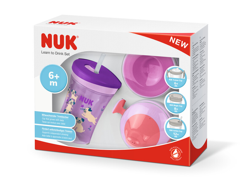 NUK Learn To Drink Set har allt som behövs för att barnet ska ta steget att börja dricka självständigt. En mugg och tre lock för olika steg i utvecklingen baserat på ålder. NUK Trainer Cup locket passar från 6 månader och upp, locket har en drickpip som är mjuk mot barnets gom. Ergonomiskt formade handtag ger barnet en mjuk övergång från att dricka ur flaska till att lära sig dricka ur pipmugg. NUK Magic Cup är locket som låter barnet dricka precis som föräldern gör ur ett glas, utan spill. Detta locket passar från 8 månaders ålder. NUK Action Cup har ett sugrör som passar det aktiva barnet från 12 månader och uppåt. Genom att skruva på locket skyddas sugröret när man är på språng.