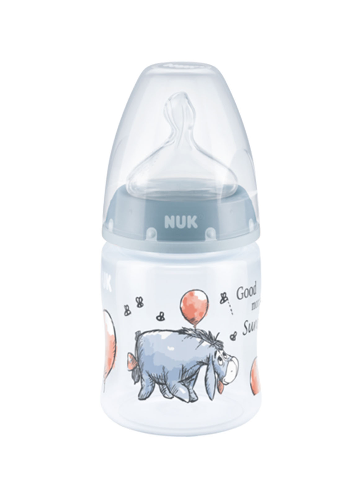 NUK First Choice+ Anti-kolik Nappflaska 0-6m med motiv av I-or från Nalle Puh är en innovativ nappflaska som hjälper föräldrar att säkerställa att maten har rätt temperatur. Med sin smarta temperaturindikator gör den det enkelt att veta när innehållet har nått en säker temperatur för matning. När indikatorn är blå är maten vid rätt temperatur, och när den blir vit är maten för varm. Detta fungerar som en extra hjälp, men ersätter inte traditionella metoder för att kontrollera temperaturen.