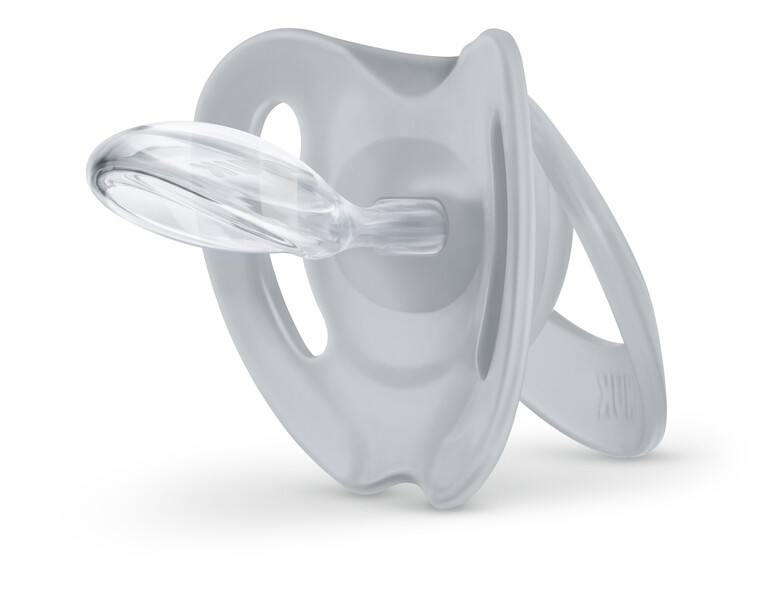 NUK Pacifier Trendline Silicon är ortodontiskt utformad för att passa det lilla barnets anatomi. Ovansidan av sugdelen lägger sig mjukt mot gommen, och undersidan lämnar plats för tungans naturliga sugrörelser. Eftersom sugdelen är smal och platt blir det nästan ingen belastning på tänder, käke eller gom.