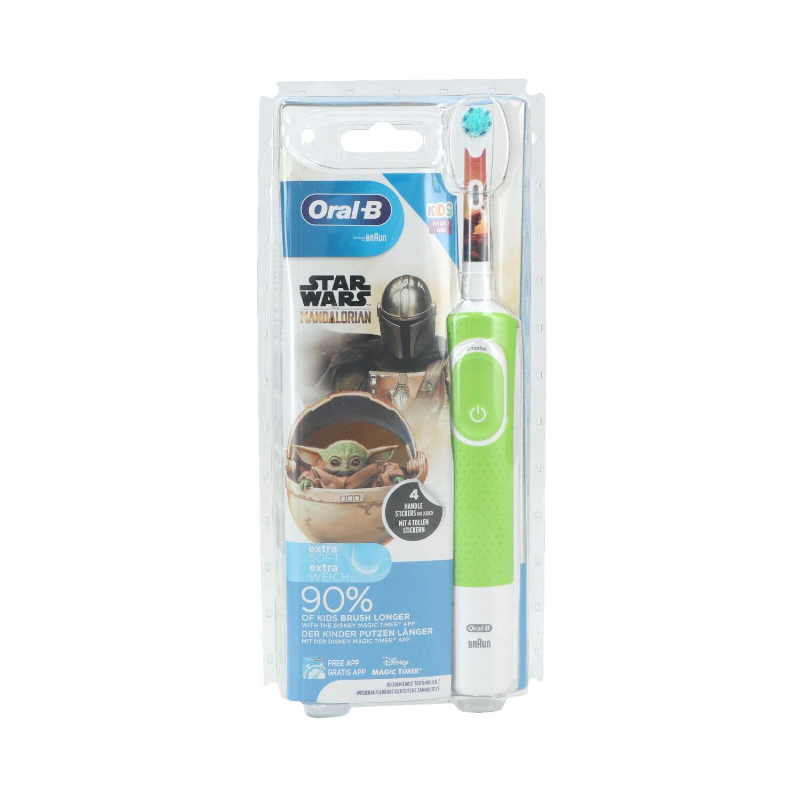 Denna elektriska tandborste med Star Wars Mandalorian-tema ger en skonsam rengöring med ett barnvänligt skonsamt läge. Den elektriska tandborsten tar bort mer plack än en manuell tandborste. Dess runda borstar med ett ultrasmidigt och mjukt borsthår är speciellt designade för små munnar. Uppladdningsbart batteri för en laddning på ca 8 dagar.
