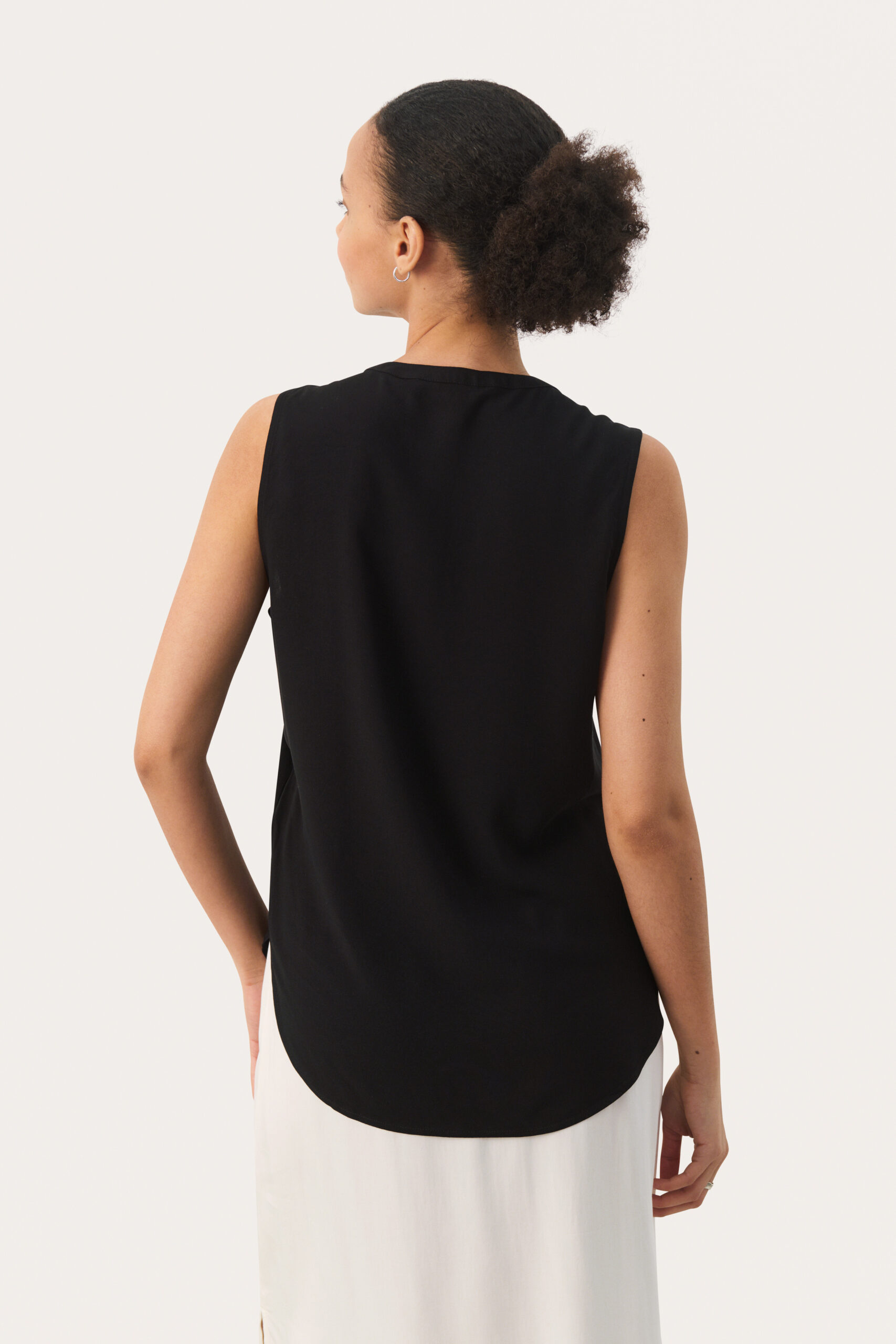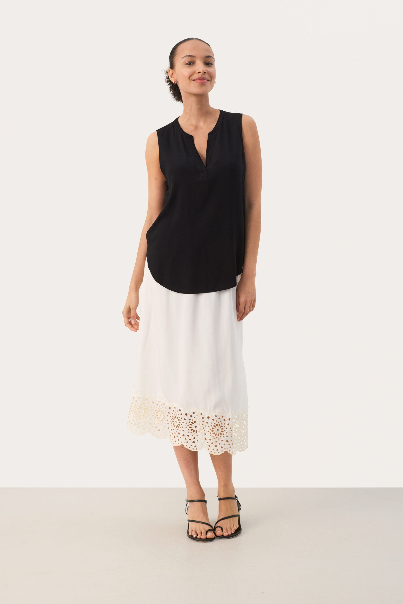 Upptäck Blus AndiaPW TO, en ärmlös topp som kombinerar stilfullt uttryck med praktisk komfort. I en delikat ljusblå nyans blir denna blus snabbt ett favoritplagg i garderoben. Den feminina V-ringningen och den rundade fållen ger en tidlös och elegant look som passar både på kontoret och för avkoppling på lediga sommardagar.