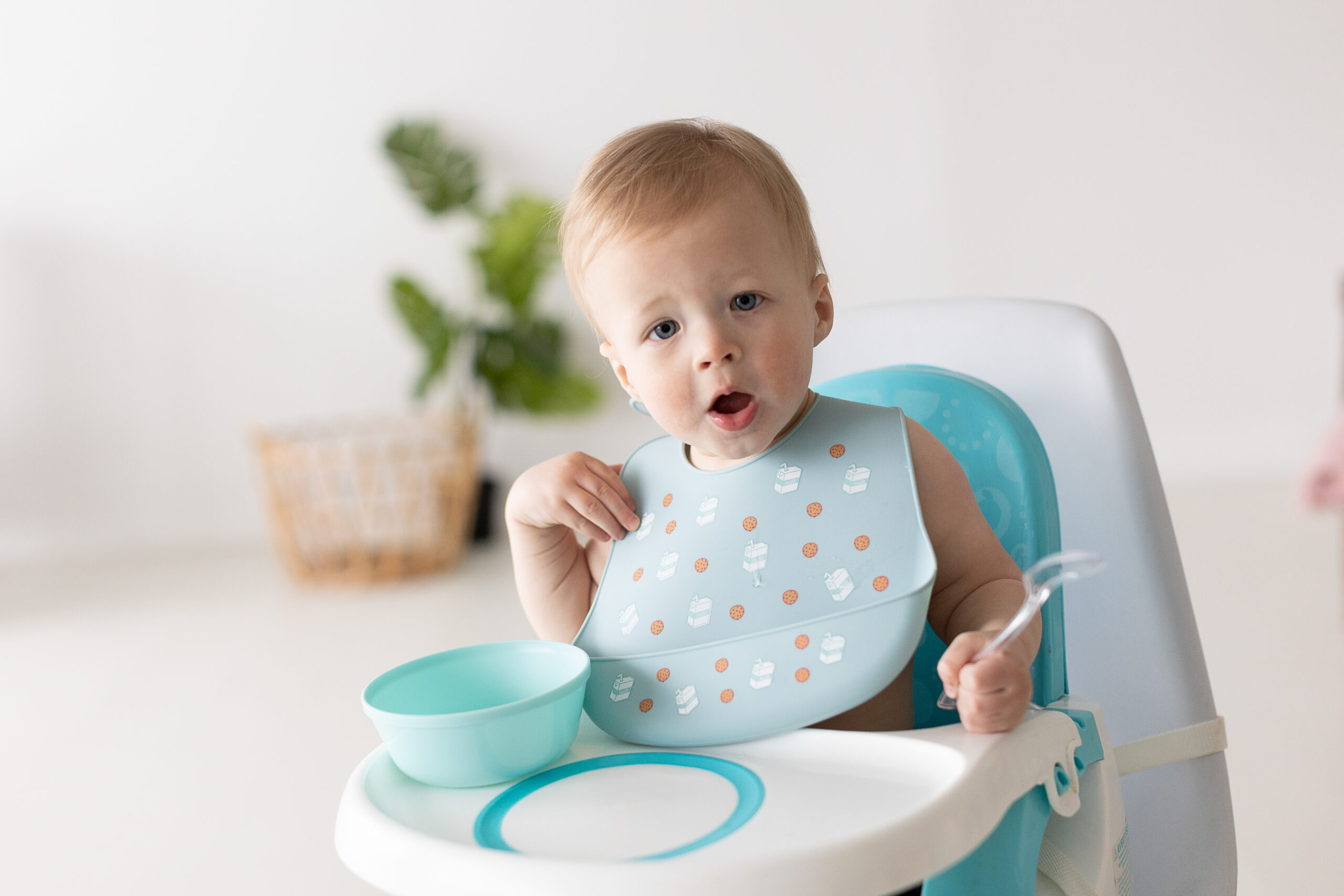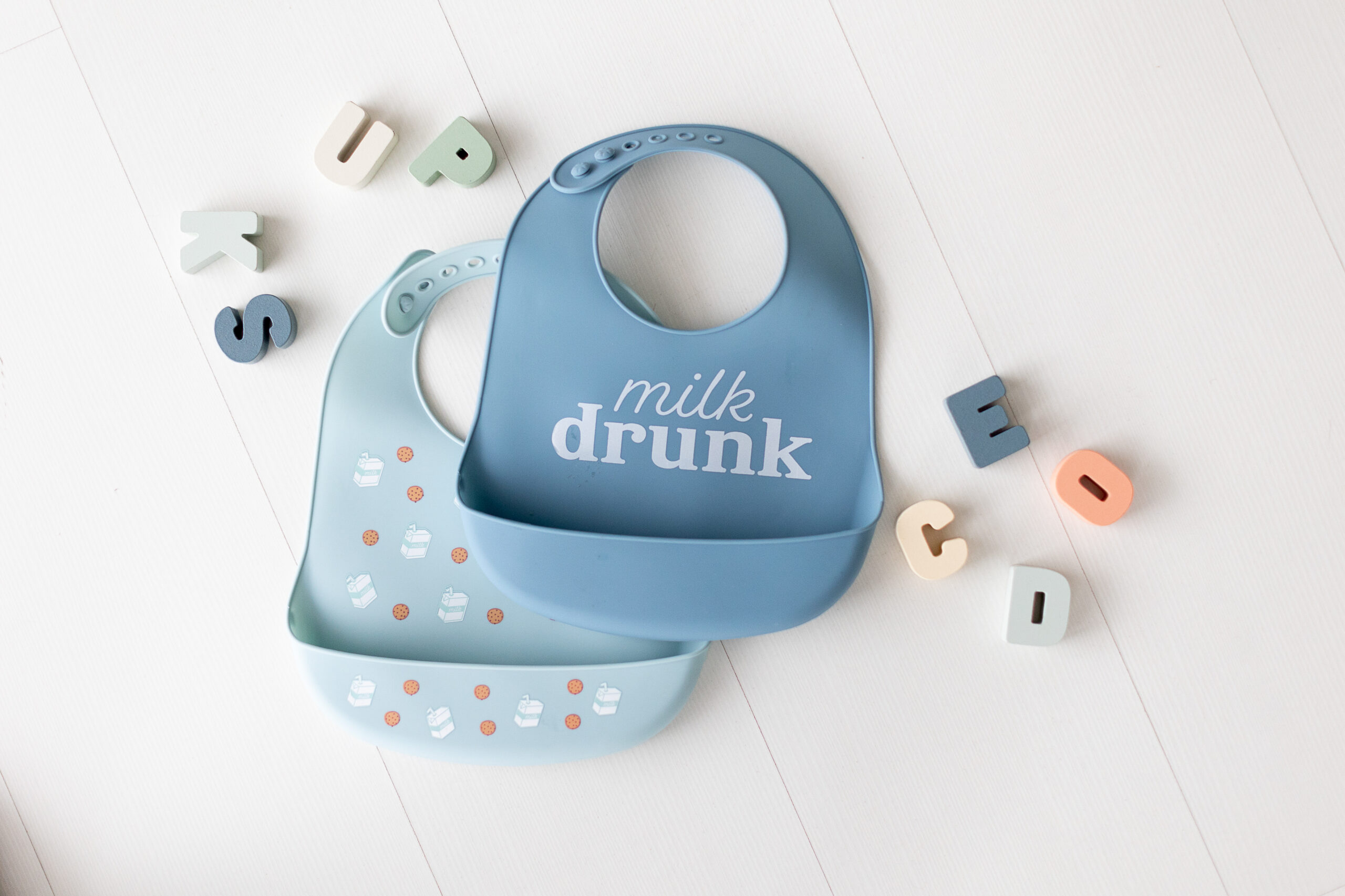 Setet innehåller två söta haklappar: en i dämpad blå med texten ”milk drunk” och en i babyblå med ett bedårande mönster av mjölk och kakor. Dessa lekfulla designer gör måltiderna roligare och mer färgglada för din lilla.