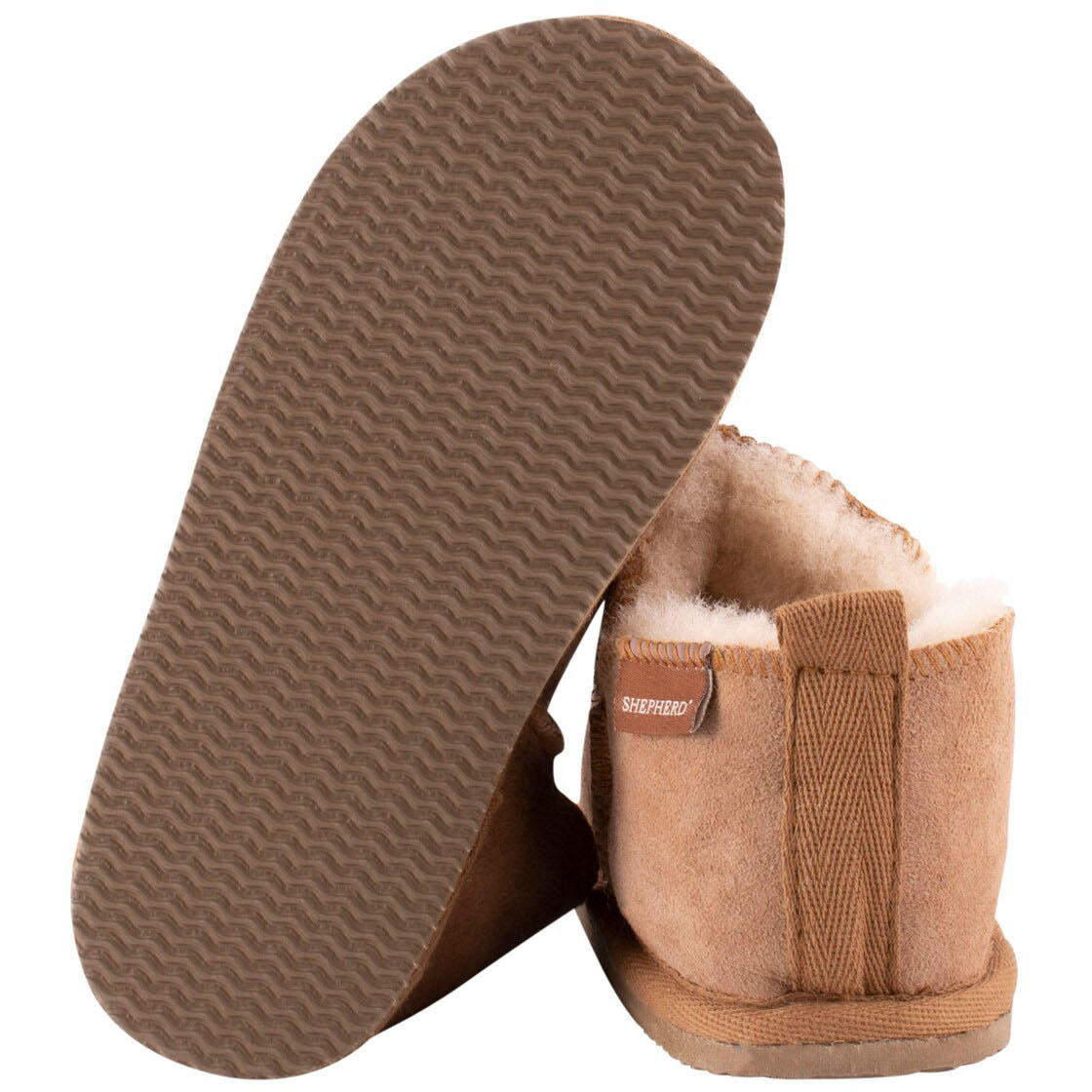 Shepherd Marseille erbjuder en ankelhög modell av barntofflor tillverkade i mjukt fårskinn, perfekta för att hålla små fötter varma och bekväma. Med ett praktiskt litet sprund på sidorna är dessa tofflor enkla att ta på och av, vilket gör dem till en favorit för både barn och föräldrar. En dekorativ utanpåliggande söm framför, kantband i textil runt öppningen, och en hälla bak förbättrar både designen och funktionaliteten. Yttersulan är gjord av EVA, vilket ger lätt vikt och utmärkt stötdämpning.