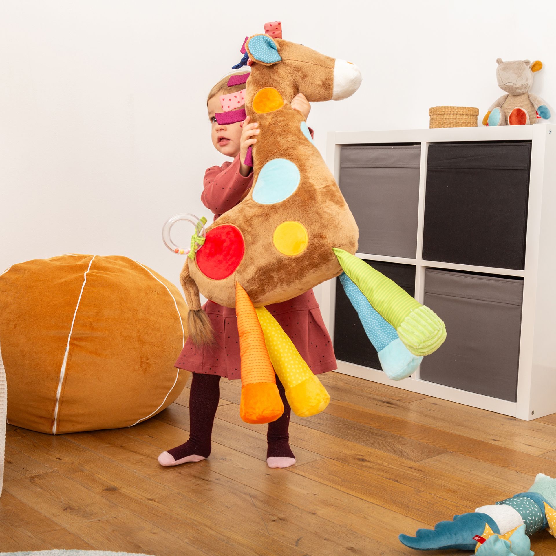 Denna leksak är perfekt under magträning och fungerar också som en dekorativ accessoar när ditt barn växer upp och börjar utforska nya typer av lek. Giraffen är tillverkad av olika typer av mjuk mikrofiberplysch och tyg, vilket gör den både mjuk och hållbar.
