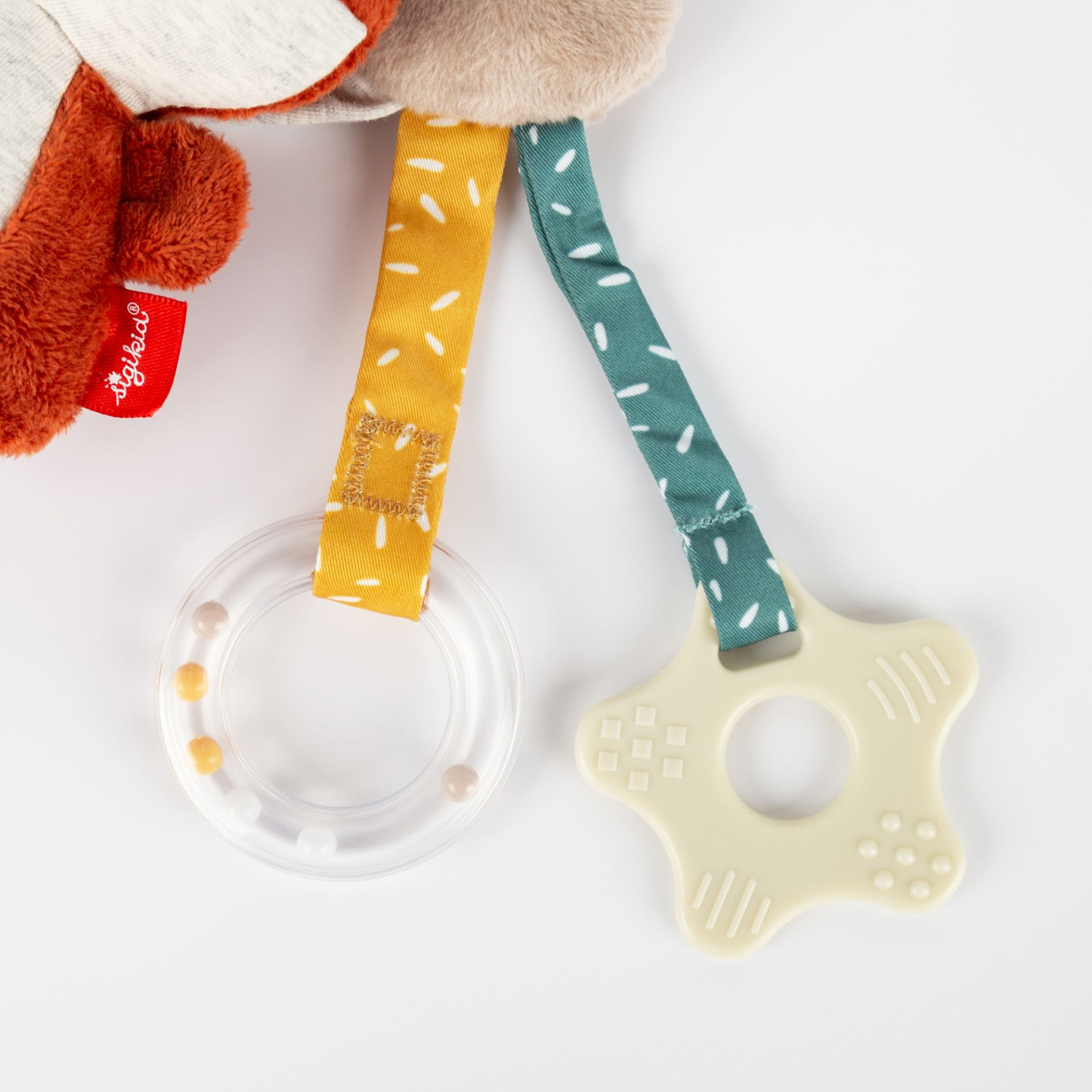 Räven är utrustad med en inbyggd pipfunktion och broderade ansiktsdrag, vilket gör den både lekfull och trygg för ditt barn. Den är lätt att fästa med hjälp av band och har en avtagbar skallring som fästs med kardborreband, vilket gör det enkelt att tvätta och hantera leksaken. De olika materialen och texturerna ger en stimulerande upplevelse för ditt barn, som kan utforska, tugga och leka medan ni är på väg.