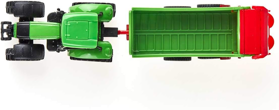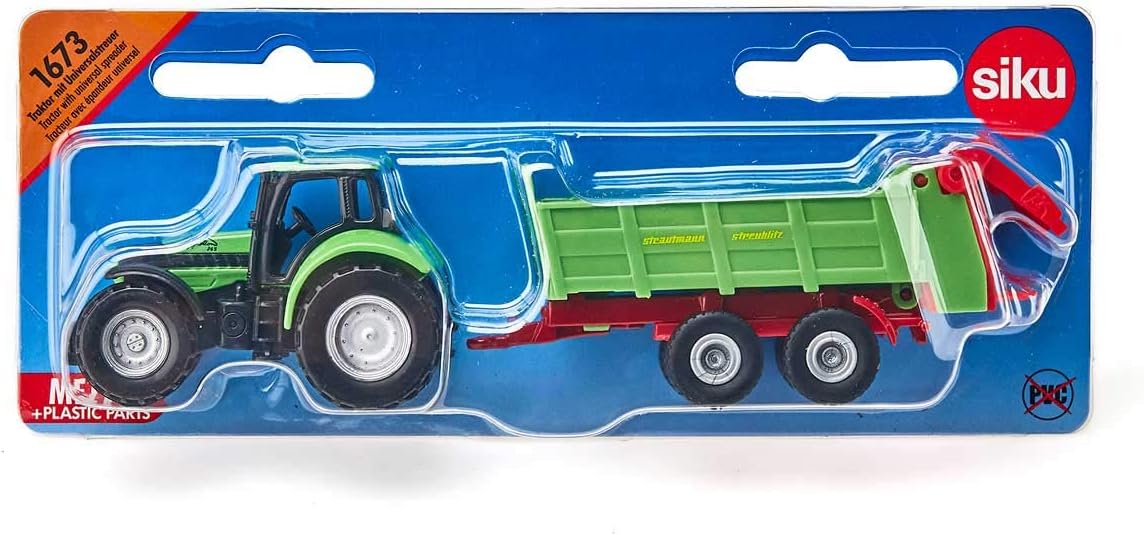 Traktor med universell gödselspridare. Få en fantastisk start på odlingssäsongen. Förvandla jordbruksarbetet till jordbruksskoj med SIKU Deutz-traktorn och den universella Strautmann-gödselspridaren som har en lucka bak till med justerbar klaff.