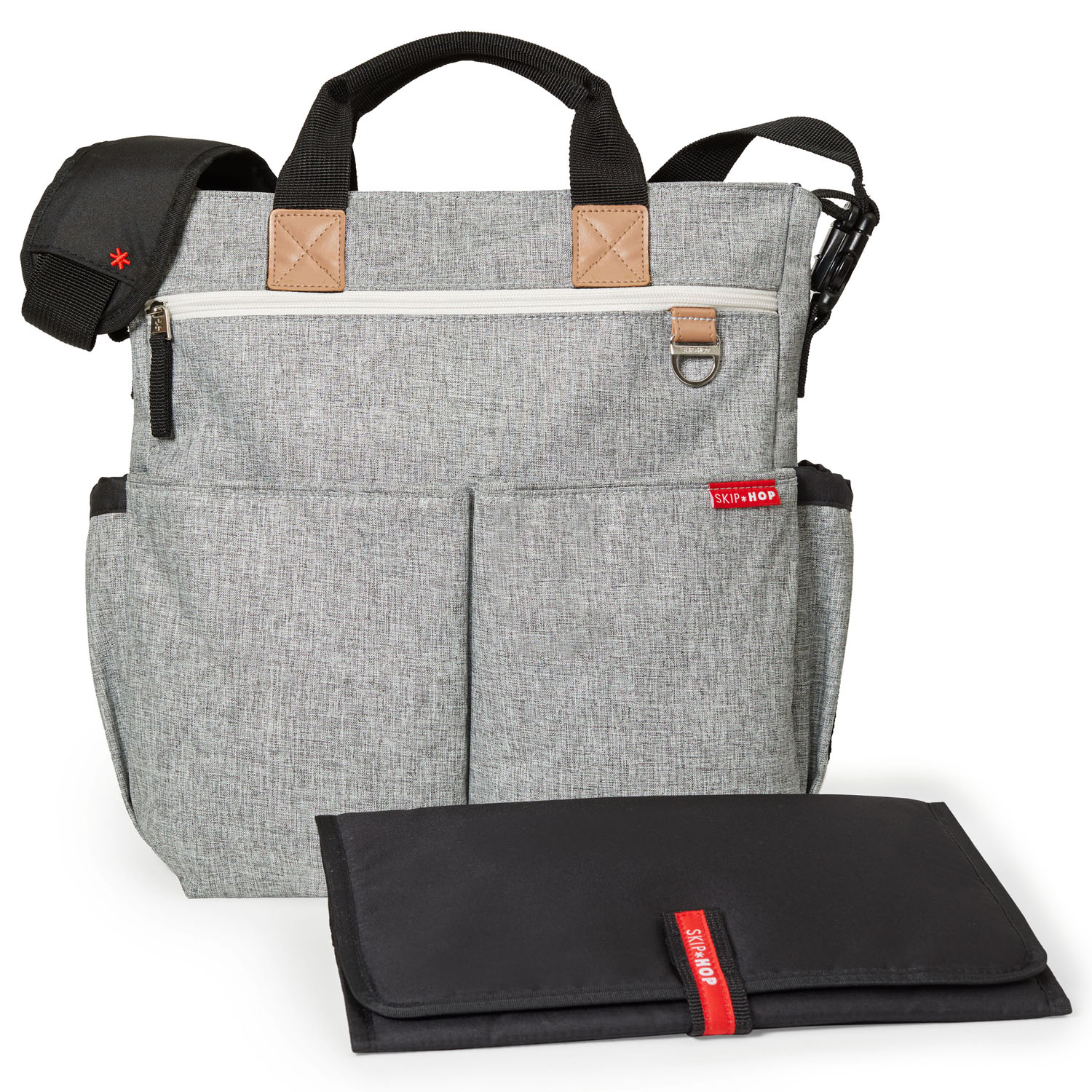 Duo Signature från Skip Hop är en mångsidig och säker väska, idealisk för den medvetna föräldern. Med en dragkedja upptill hålls dina saker säkert på plats, och väskans design med fickor på både nät och tyg ger en stilren och praktisk look.